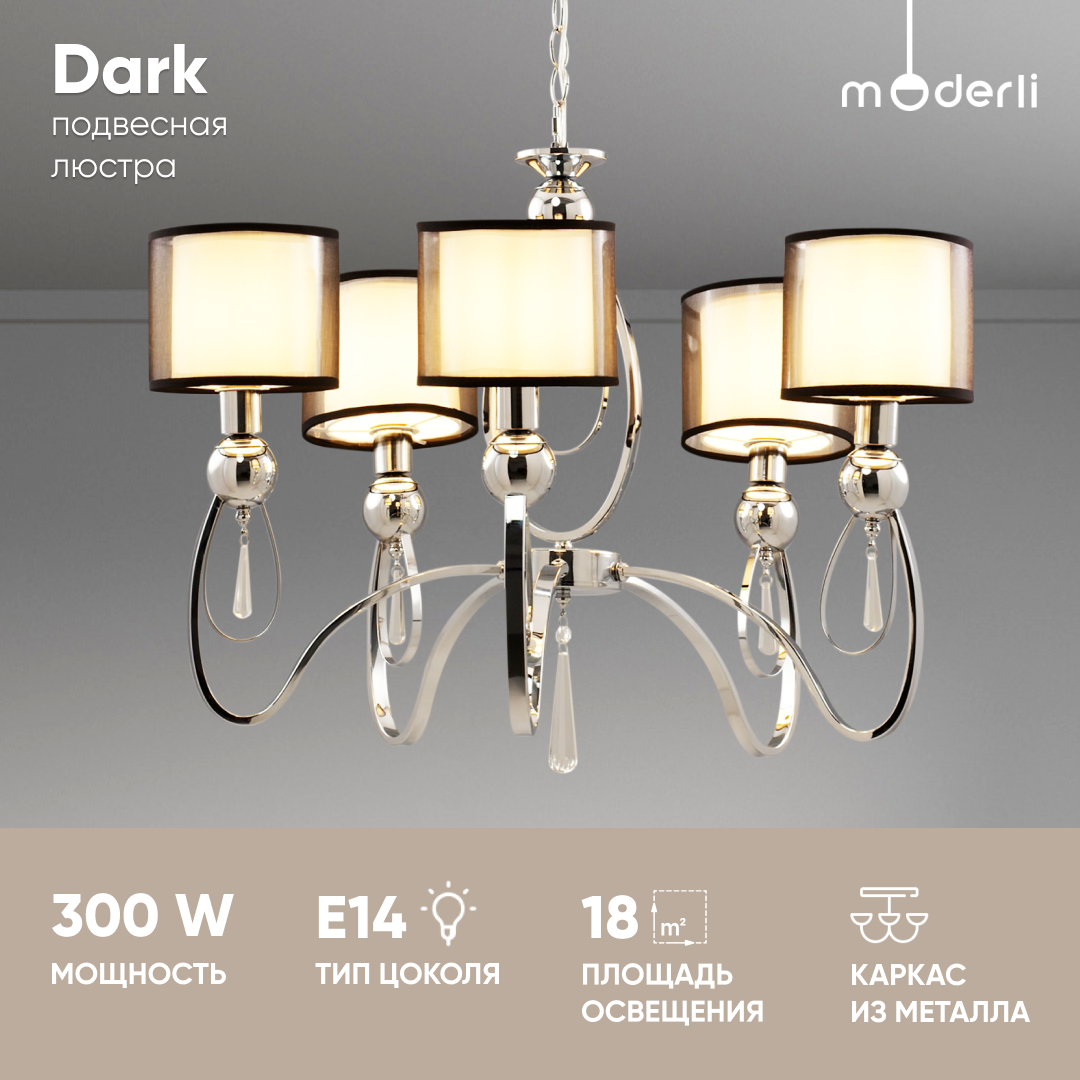 Подвесная люстра Dark - продукт известной компании Moderli (Италия). Имеет максимальную мощность 300 Вт, освещает площадь до 18 кв. м. Отлично подойдет для таких мест, как гостиная, спальня, кухня, над обеденным столом, кабинет. Впишется в интерьеры следующих стилей: модерн.