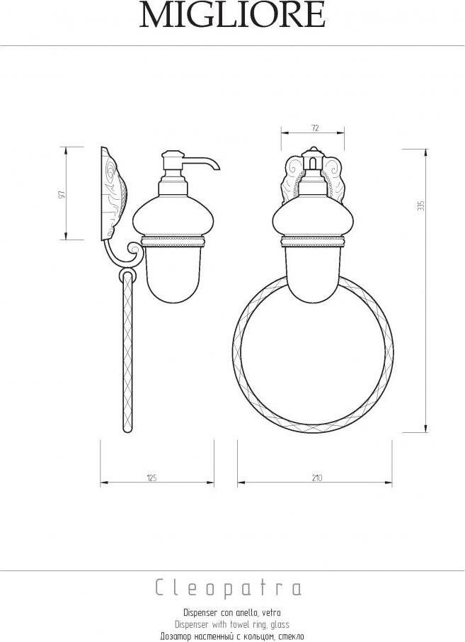 Италия родина бренда Migliore, вся продукция производится со строгим соблюдением всех стандартов, благодаря чему можно быть абсолютно уверенным в надежности и высоком качестве. Дозатор Migliore Cleopatra настенный с кольцом создаст уют и комфорт в любом дизайнерском решении, и ванная комната обретет неповторимый элемент интерьера.