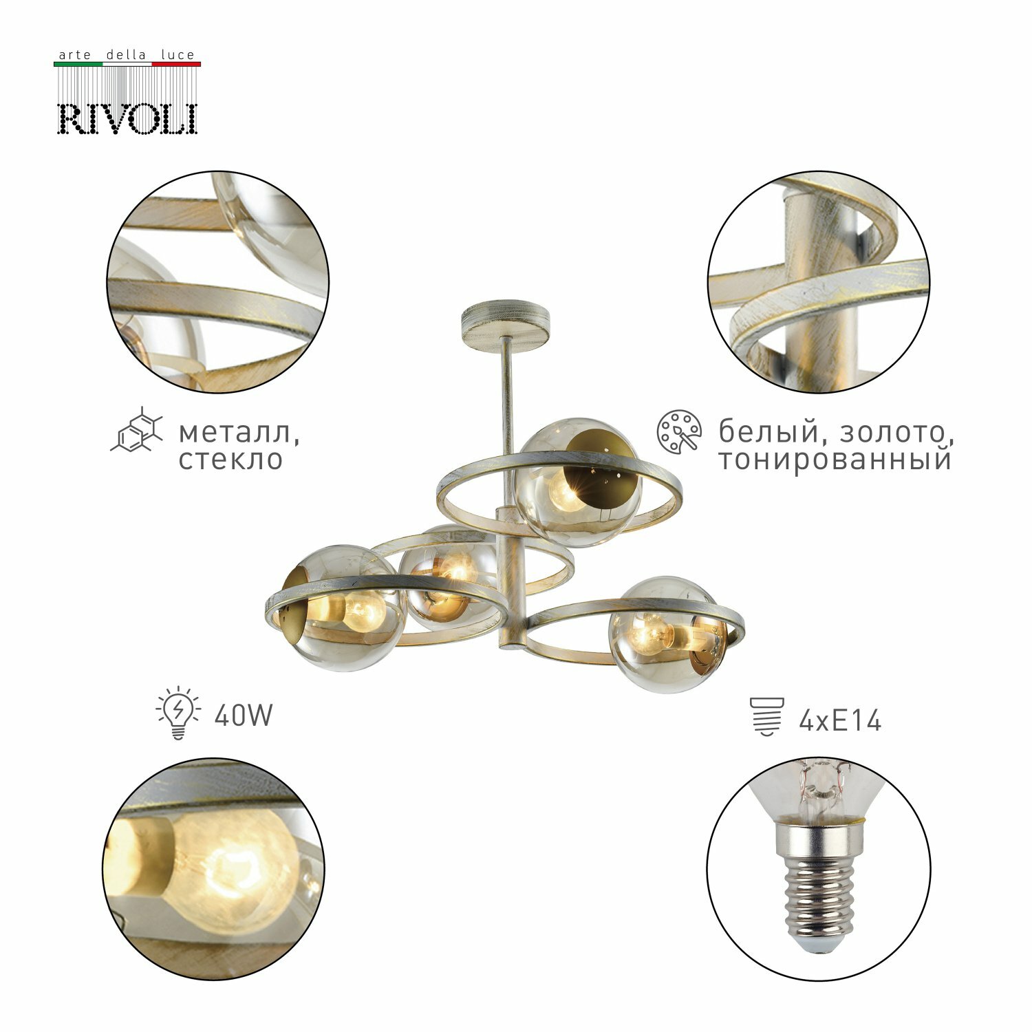 Люстра потолочная на штанге Sarita 4 х E14 40 Вт - продукт известной компании Rivoli (Италия). Имеет максимальную мощность 160 Вт, освещает площадь до 12 кв. м. Отлично подойдет для таких мест, как гостиная, спальня, кухня. Впишется в интерьеры следующих стилей: модерн.