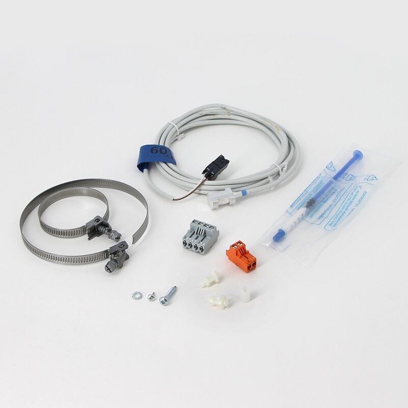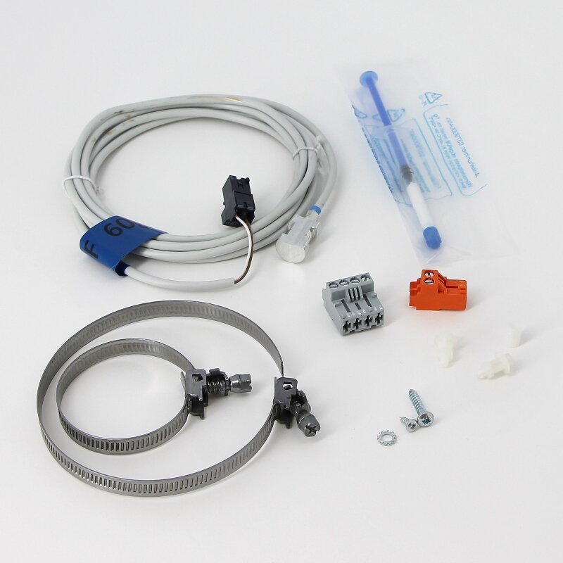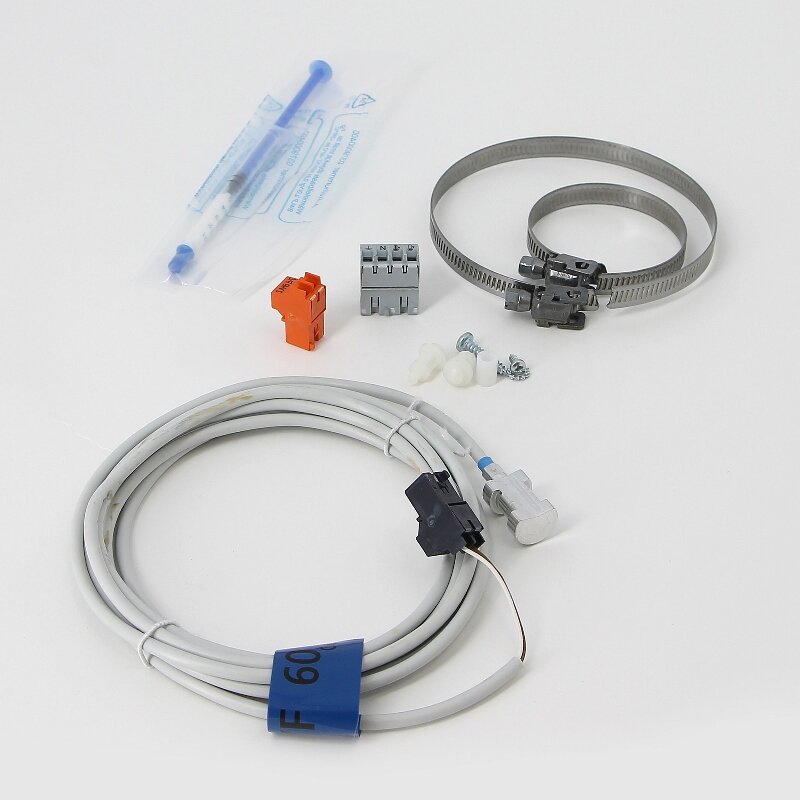 Датчик температуры смесительного контура, AD199, De Dietrich . Датчик температуры подающей линии с соединительным кабелем (длиной 2.5 м) и разъемом для подключения устанавливается на подающем трубопроводе данного контура и должен быть подключен на предусмотренный разъем панели управления. Подключение дополнительного оборудования - датчика подающей линии позволяет управлять.