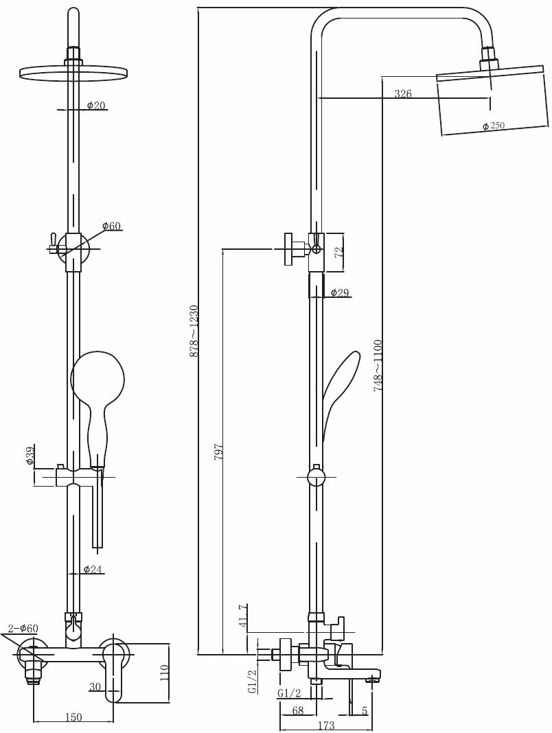 | Габариты верхнего душа | 250 |
