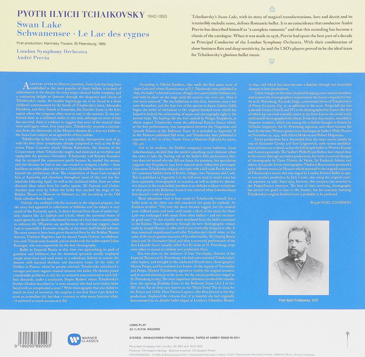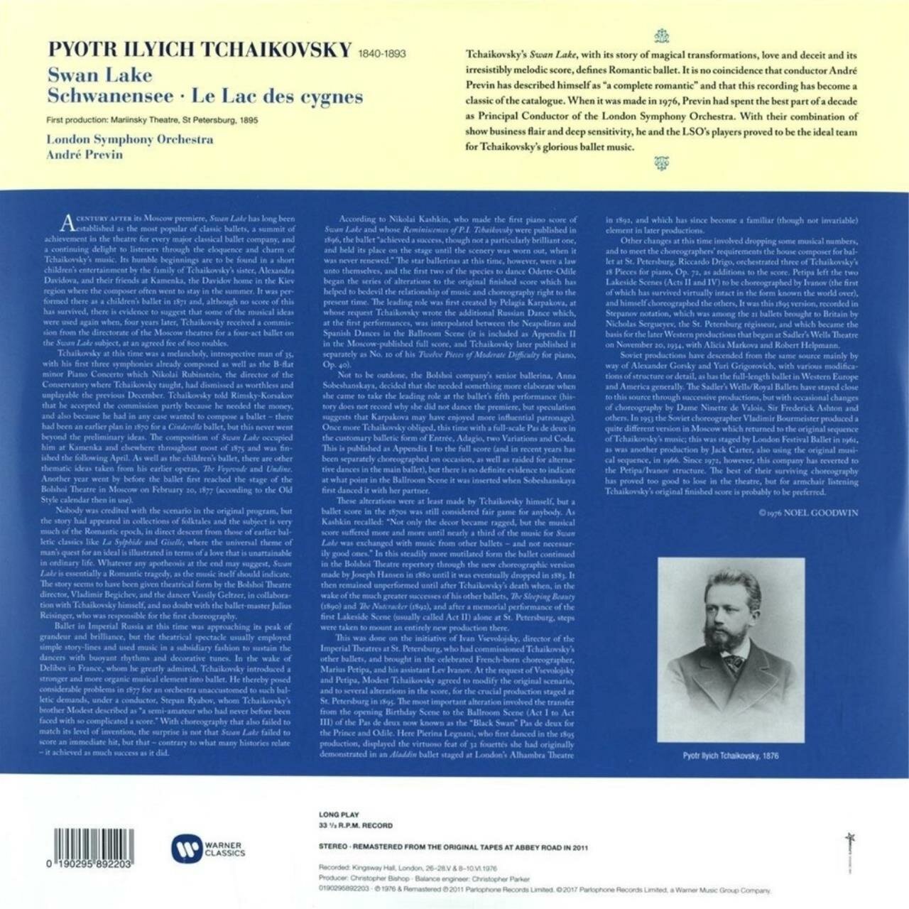 Знаменитый американский дирижёр, пианист и композитор Андре Превин, обладатель нескольких премий «Оскар» за лучшую музыку, сделал эту историческую запись балета Чайковского в 1976-м году, когда он возглавлял прославленный Лондонский симфонический оркестр. Ремастированная запись на тройном 180-граммовом виниле выходит с оригинальной обложкой знаменитого иллюстратора Dick Ellescas и оригинальной рецензией популярного музыкального критика Ноэла Гудвина.