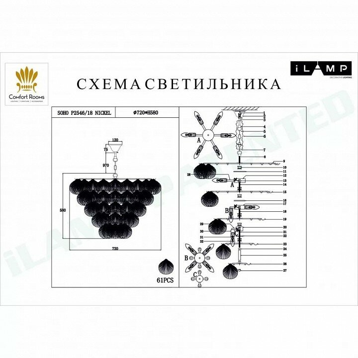 Подвесная люстра Soho - продукт известной компании iLamp (Россия). Имеет максимальную мощность 720 Вт, освещает площадь до 36 кв. м. Отлично подойдет для таких мест, как гостиная, спальня, кухня, кабинет. Впишется в интерьеры следующих стилей: модерн.