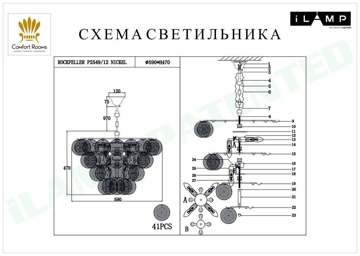 Подвесная люстра Rockfeller - продукт известной компании iLamp (Россия). Имеет максимальную мощность 480 Вт, освещает площадь до 24 кв. м. Отлично подойдет для таких мест, как гостиная, спальня, кухня, кабинет. Впишется в интерьеры следующих стилей: модерн.
