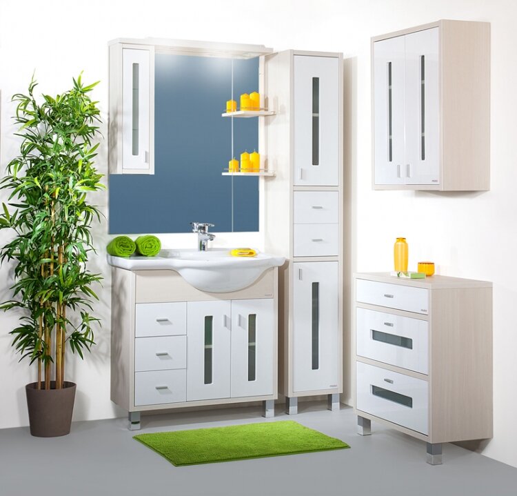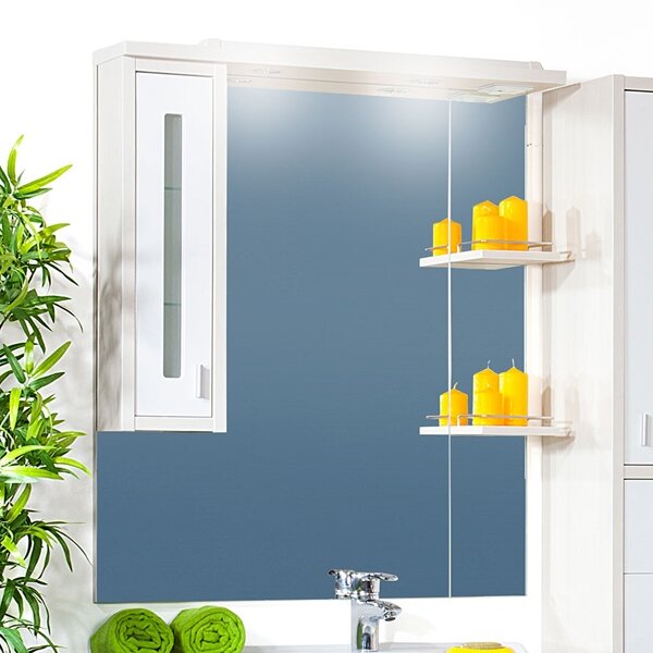 Зеркало Бали 90 изготавливается с правым и левым расположением шкафчика. Внутри шкафчика находится две полки. На верхней планке зеркала находится подсветка, в виде двух галогеновых встраиваемых светильников, по 20 Ватт каждый, которые подключены с помощью трансформатора 12Вт. Рядом со светильниками находится розетка на 220 Вт.