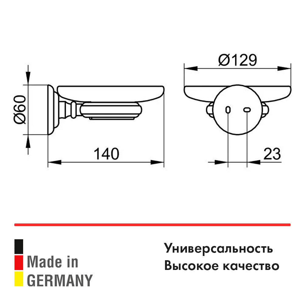 Производитель Keuco в своей продукции использует идеальное, сочетание материалов (латунь, хрусталь) высокого качества, с абсолютным отсутствием вредных для здоровья веществ. Хром, основной цвет исполнения Keuco Astor, гармонирующий с большинством интерьерных решений. Ключевые габариты изделия: ширина 12.9 см, глубина 14 см, высота 6 см. Круглая форма прослеживается во всех линиях и придает аксессуару неповторимый стиль. Мыльница размещается в самом удобном положении на стене благодаря подвесному способу установки.