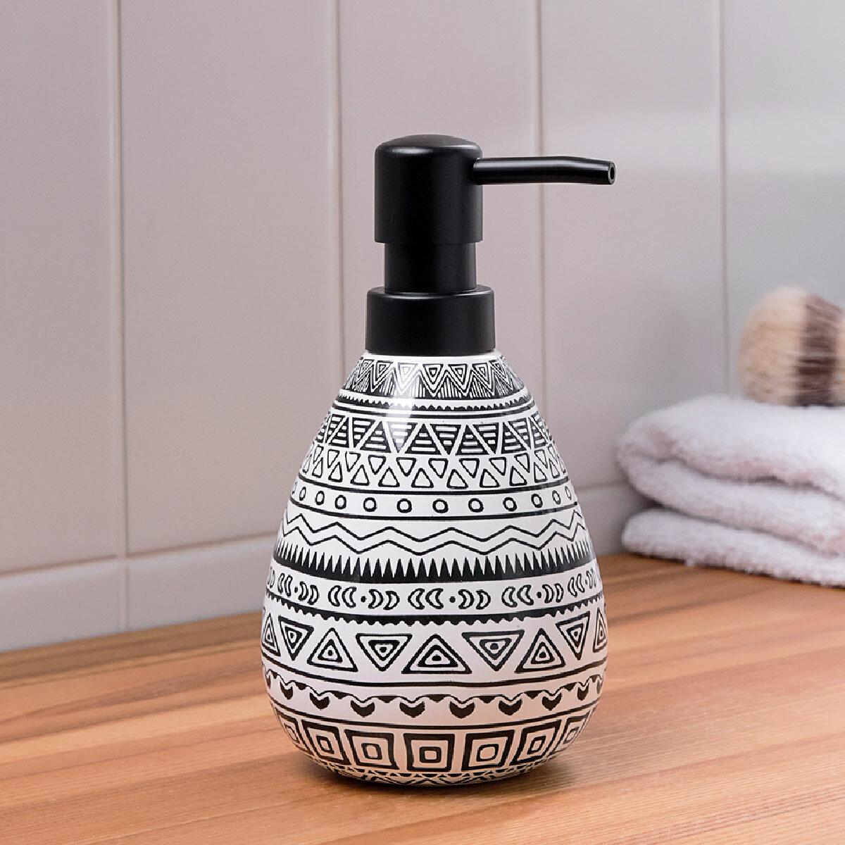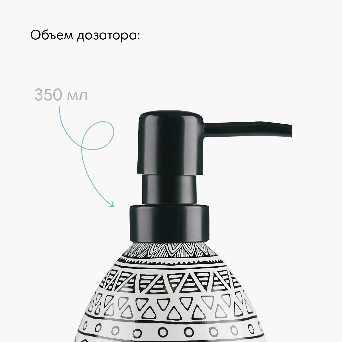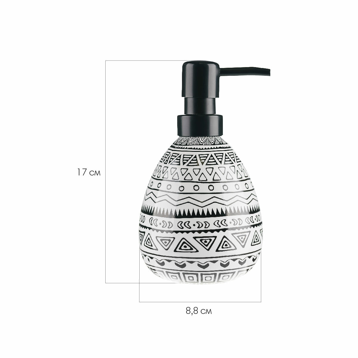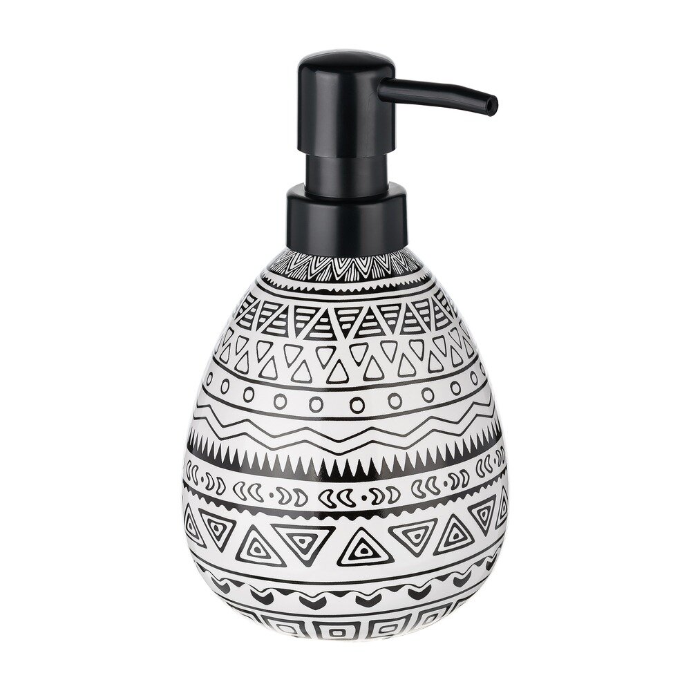 Керамический дозатор для жидкого мыла с геометрическим узором в виде ромбов. высота 17 см, диаметр=7.5 см, Объем 0,4л. Помимо жидкого мыла в нём можно хранить шампунь, гель для душа и другие косметические средства. Оригинальный дизайн изделия и сочетание цветов позволяют гармонично вписать его в интерьерный образ, созданный аксессуарами из коллекции Memphis: занавесками для ванной, ковриками, мыльницами и другими.