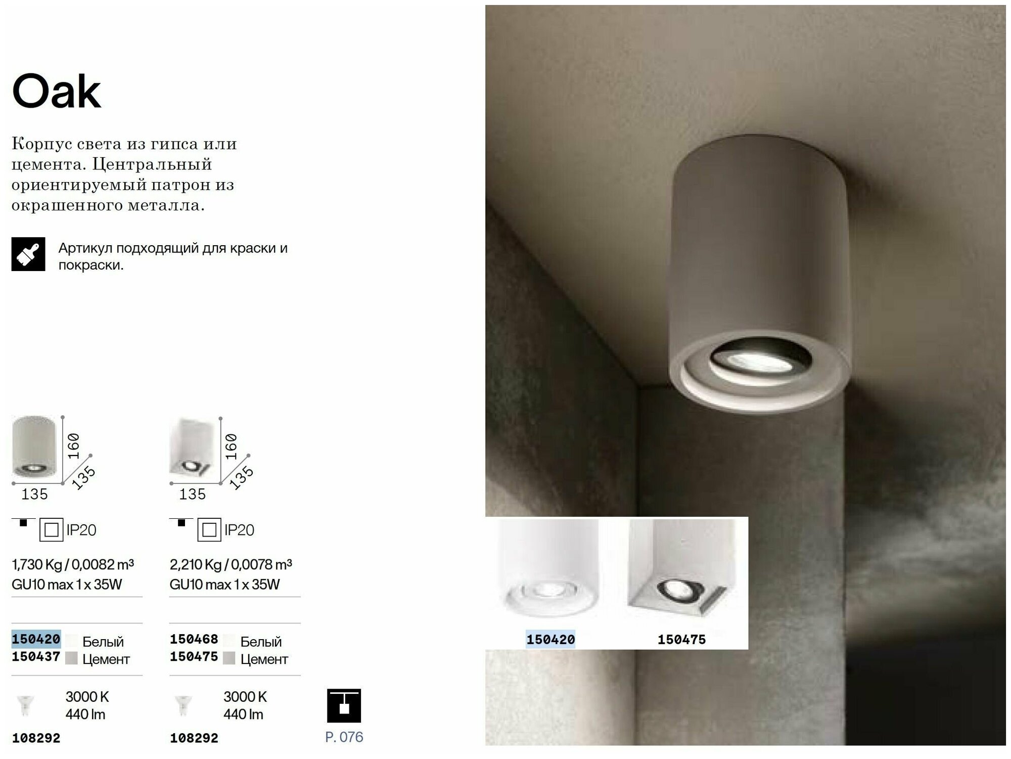 Светильник потолочный ideal lux Oak PL1 Round макс.1х35Вт IP20 GU10 230В Серый Цемент/Металл Без лампы 150437.- Корпус светильника из натурального цемента.- Центральная часть поворотная изготовлена из металла окрашенного в черный цвет.- Источники света сменные.- Диаметр светильника 135 мм, высота 160 мм, высота люстры без подвеса 450 мм, диаметр основания 135 мм.- Класс электробезопасности: II.- Степень защиты IP: 20.- Европейский сертификат качества: CE.- Рабочая температура от 0° до +40°.- Лампы в комплекте нет.- Рекомендуемая лампа: арт. 108292 (Lampadine GU10 5Вт 480Лм 3000К CRI90 Прозрачный Не диммируемая).- Гарантия: 5 лет.- Варианты доступных цветов: Белый (арт. 150420), Цемент (арт. 150437).- В коллекции Oak есть подвсные светильники из натурального цемента. Светильники представлены на дополнительном фото.- Артикул подходящий для краски и покраски.- Для проектирования в AutoCAD можем предоставить файлы 3D модели.- При отсутствии товара на нашем складе возможен его заказ на фабрике в Италии. Для заказа необходимо связаться с нами используя чат маркета.