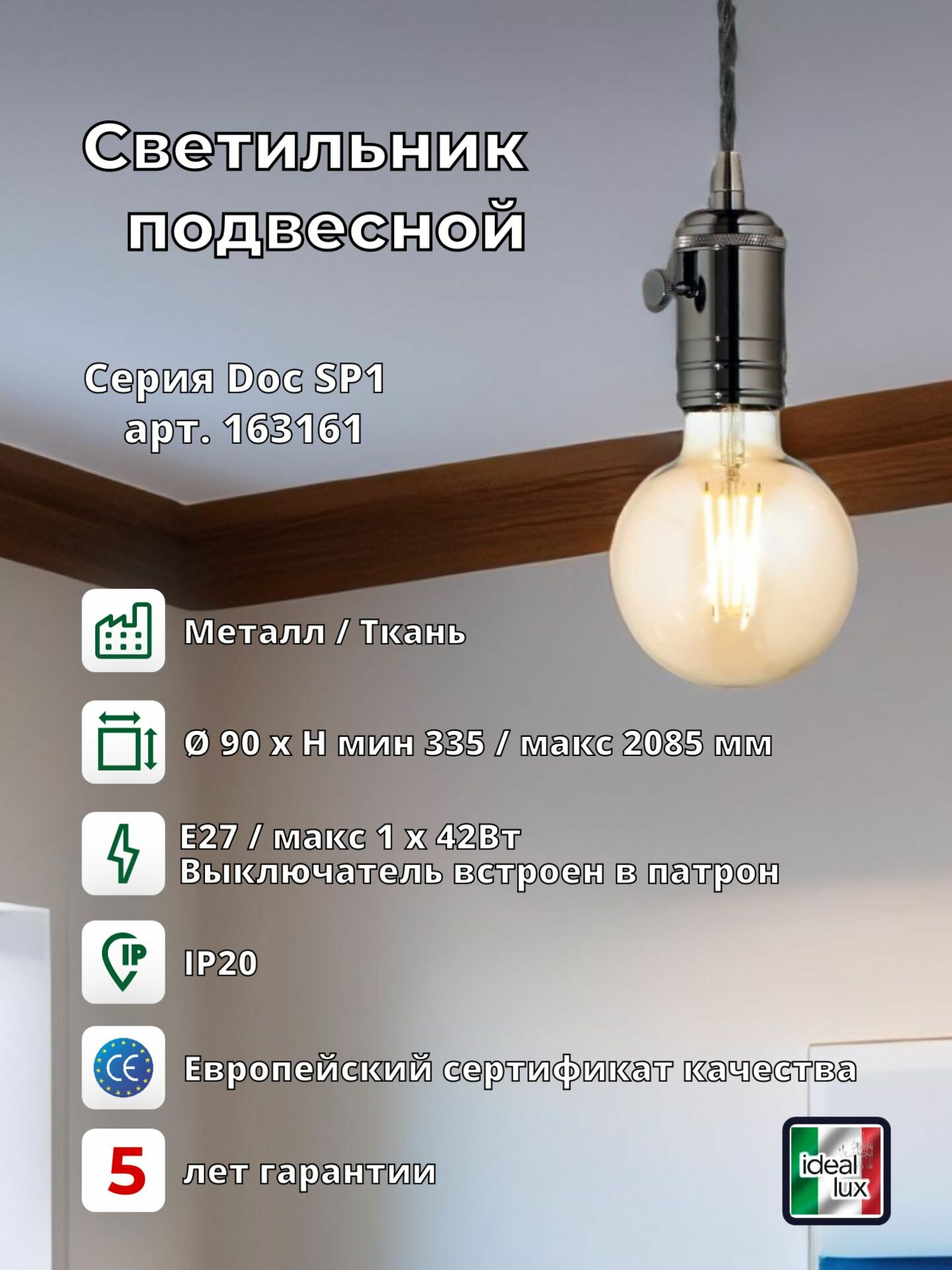 Светильник подвесной ideal lux Doc SP1 макс.1х60Вт IP20 Е27 230В Латунь античная Металл/Ткань Выключатель Без лампы 163109.- Потолочная чаша и покрывающие патроны колбы из металла окрашенного в цвет античной латуни.- Провод из чёрной ткани.- Выключатель встроенный в патрон.- Диаметр светильника 90 мм, высота мин.335 / макс.2085 мм, высота колбы патрона 85 мм, диаметр потолочной чаши 90 мм.- Класс электробезопасности: II.- Степень защиты IP: 20.- Европейский сертификат качества: CE.- Рабочая температура от 0° до +40°.- Лампы в комплекте нет.- Рекомендуемая лампа: арт. 223933 (Globo small 4Вт 330Лм 2200К CRI80 Е27 Янтарь Не диммируемая).- Гарантия: 5 лет.- Варианты доступных цветов: Античная латунь (арт. 163109), Свинец (арт. 163161), Латунь (арт. 163154), Медь (арт. 163123).- Для проектирования в AutoCAD можем предоставить файлы 3D модели.- При отсутствии товара на нашем складе возможен его заказ на фабрике в Италии. Для заказа необходимо связаться с нами используя чат маркета.