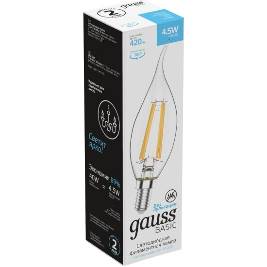 Светодиодная лампа GAUSS серии Basic Filament. Даст комфортный свет в комнате. Длина 12 cm. Диаметр 3.5 cm Параметры пылевлагозащиты IP — 20. Плафон белого цвета. Использует лампу с цоколем E14. Страна происхождения бренда — РОССИЯ.