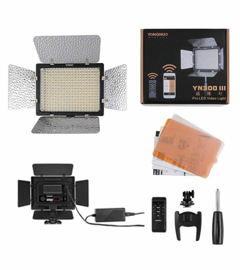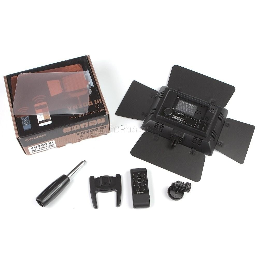 Новейшая модель YONGNUO имеет индекс III и она более совершенная, чем предыдущие версии этого семейства, так как построена на более ярких светодиодах с лучшим кпд и большим временем жизни, а также имеет пульт дистанционного управления и возможность управления от смартфона (приложение для смартфона скачивается бесплатно с сайта изготовителя). В комплект поставки не входит адаптер питания от сети и/или аккумуляторная батарея.