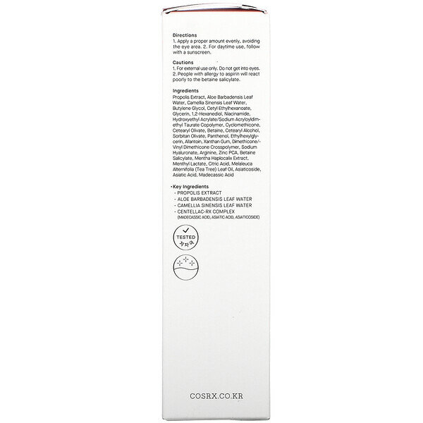 | Состав | Propolis Extract, Aloe Barbadensis Leaf Water, Camellia Sinensis Leaf Water, Butylene Glycol, Cetyl Ethylhexanoate, Glycerin, 1,2-Hexanediol, Niacinamide, Hydroxyethyl Acrylate/Sodium Acryloyldimethyl Taurate Copolymer, Cyclomethicone, Cetearyl Olivate, Betaine, Cetearyl Alcohol, Sorbitan Olivate, Panthenol, Ethylhexylglycerin, Allantoin, Xanthan gum, Dimethicone/Vinyl Dimethicone Crosspolymer, Sodium Hyaluronate, Arginine, Zinc PCA, Betaine Salicylate, Mentha Haplocalix Extract, Menthyl Lactate, Citric Acid, Melaleuca Alternifolia (Tea Tree) Leaf Oil, Asiaticoside, Asiatic Acid, Madecassic Acid |
