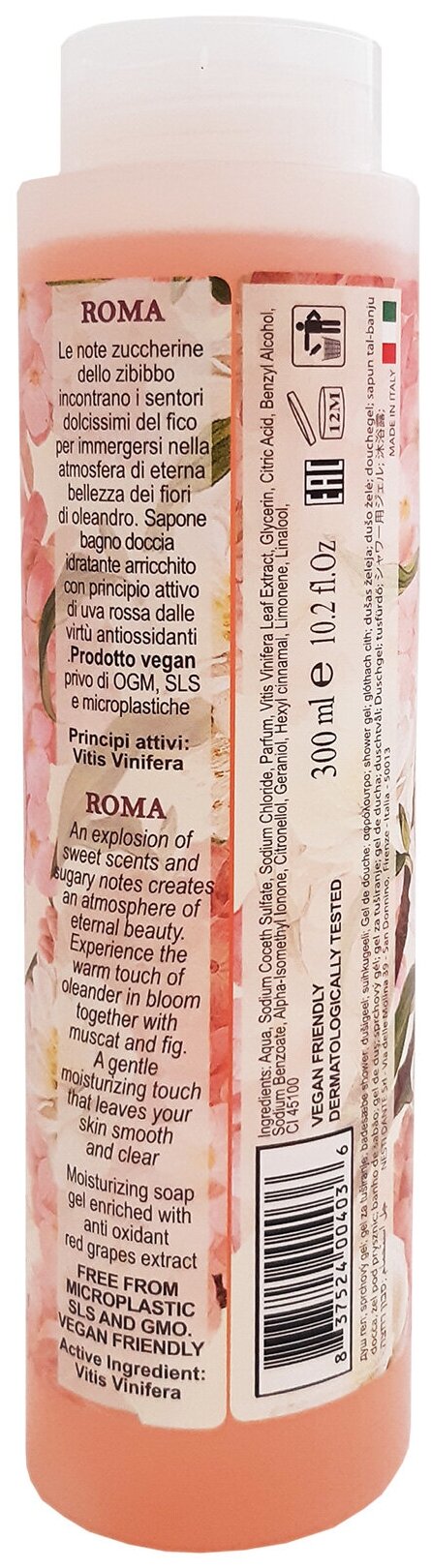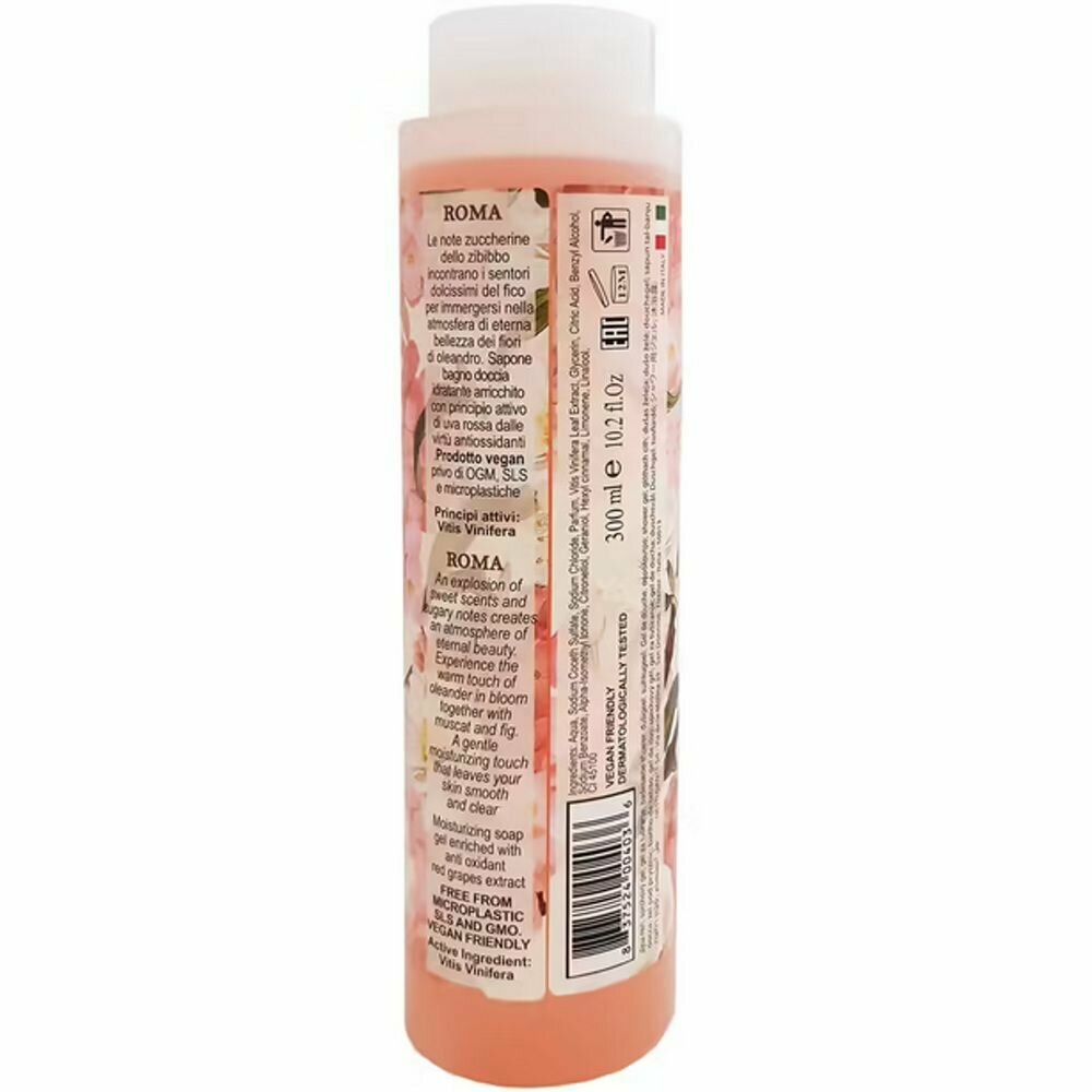 Гель для душа Roma (Рим) создает атмосферу безмятежности и легкости, погруженную в тонкий сладковато-цветочный аромат. Почувствуйте теплое прикосновение цветов олеандра, муската и зелени инжира.