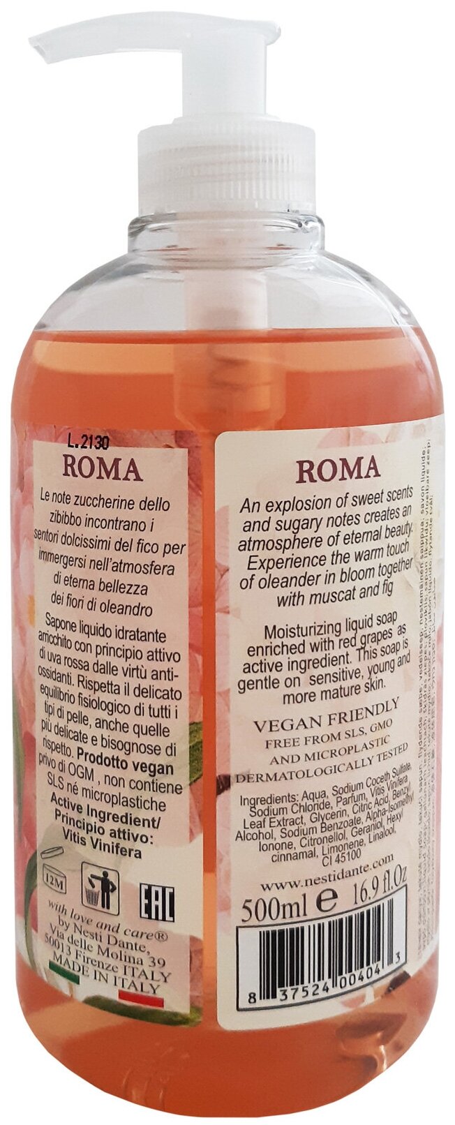 Жидкое мыло Roma (Рим) создает атмосферу безмятежности и легкости, погруженную в тонкий сладковато-цветочный аромат. Почувствуйте теплое прикосновение цветов олеандра, муската и зелени инжира.