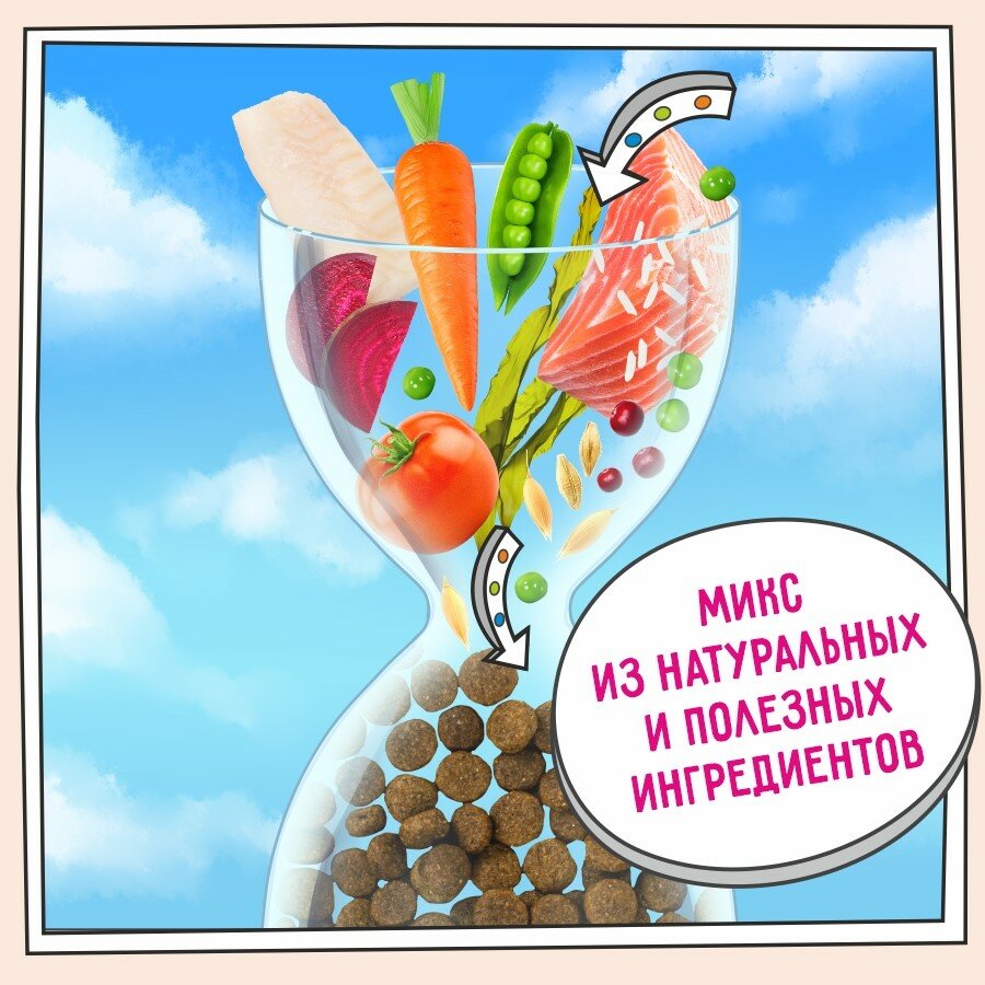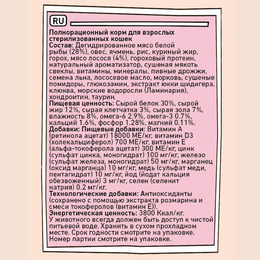 Состав: Дегидрированное мясо белой рыбы (28%), овес, ячмень, рис, куриный жир, горох, мясо лосося (4%), гороховый протеин, натуральный ароматизатор, сушеная мякоть свеклы, витамины, минералы,