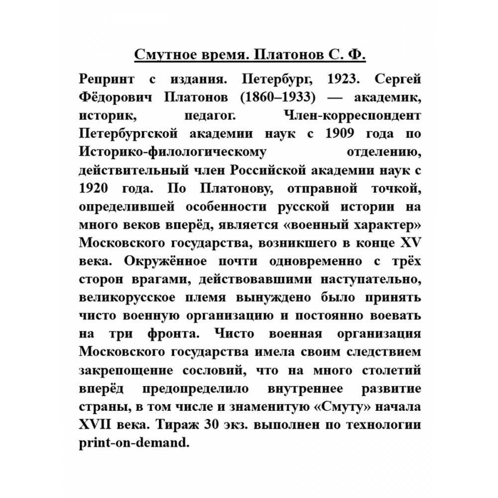 Репринт с издания. Петербург, 1923. Сергей Фёдорович Платонов (1860 — 1933) — академик, историк, педагог. Член-корреспондент Петербургской академии наук с 1909 года по Историко-филологическому отделению, действительный член Российской академии наук с 1920 года. По Платонову, отправной точкой, определившей особенности русской истории на много веков вперёд, является «военный характер» Московского государства, возникшего в конце XV века. Окружённое почти одновременно с трёх сторон врагами, действовавшими наступательно, великорусское племя вынуждено было принять чисто военную организацию и постоянно воевать на три фронта. Чисто военная организация Московского государства имела своим следствием закрепощение сословий, что на много столетий вперёд предопределило внутреннее развитие страны, в том числе и знаменитую «Смуту» начала XVII века. Тираж 30 экз. выполнен по технологии print-on-demand.