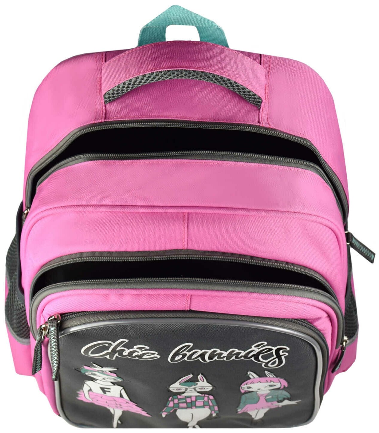 Рюкзак школьный. ЗАЙКИ ФЕШН. Размер: 29х38.5х13.5 см. Материал: полиэстер. Количество отделений - 2. Внутренняя организация: карман на резинке, органайзер для канцелярских принадлежностей. Застёжка - молния. Материал собачки: лента репсовая. Форма собачки: хляст. Количество наружных карманов - 3. Тип спинки - формоустойчивая спинка из сетчатой ткани и поролона. Тип дна - с пластиковыми ножками. Отделка: высокая печать. Цвет - розовый, серый. Особенности: водоотталкивающая ткань, лямки, регулируемые по длине, светоотражающие элементы, фронтальный карман с удобной конструкцией и дополнительными отделениями для канцелярских принадлежностей. Подклада: брендированная подклада. Индивидуальная упаковка: ПЭТ-пакет.