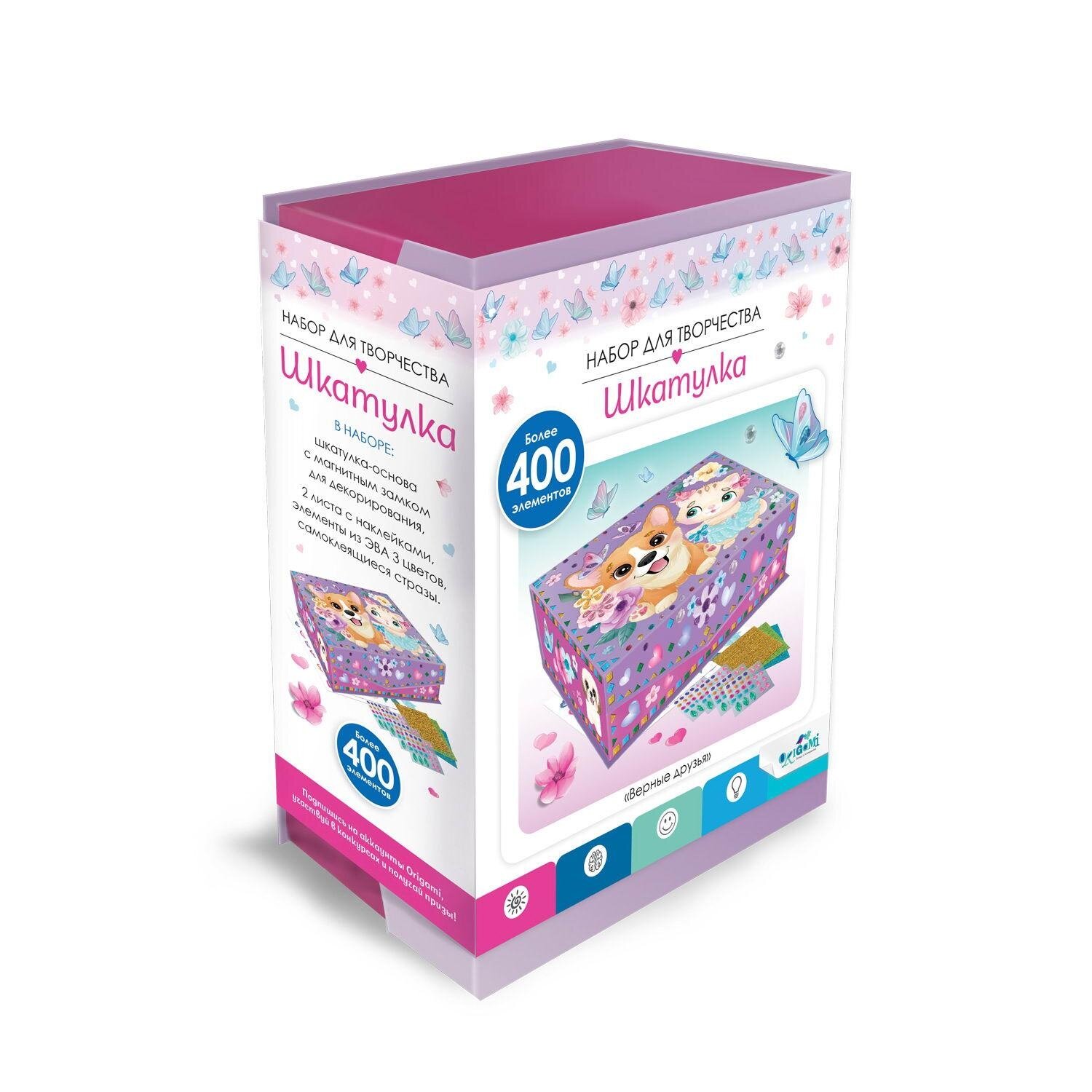 Состав набора | шкатулка с магнитным замком, 3 листа с наклейками 15х20 см, самоклеящиеся элементы из EVA 3 цветов, самоклеящиеся стразы |