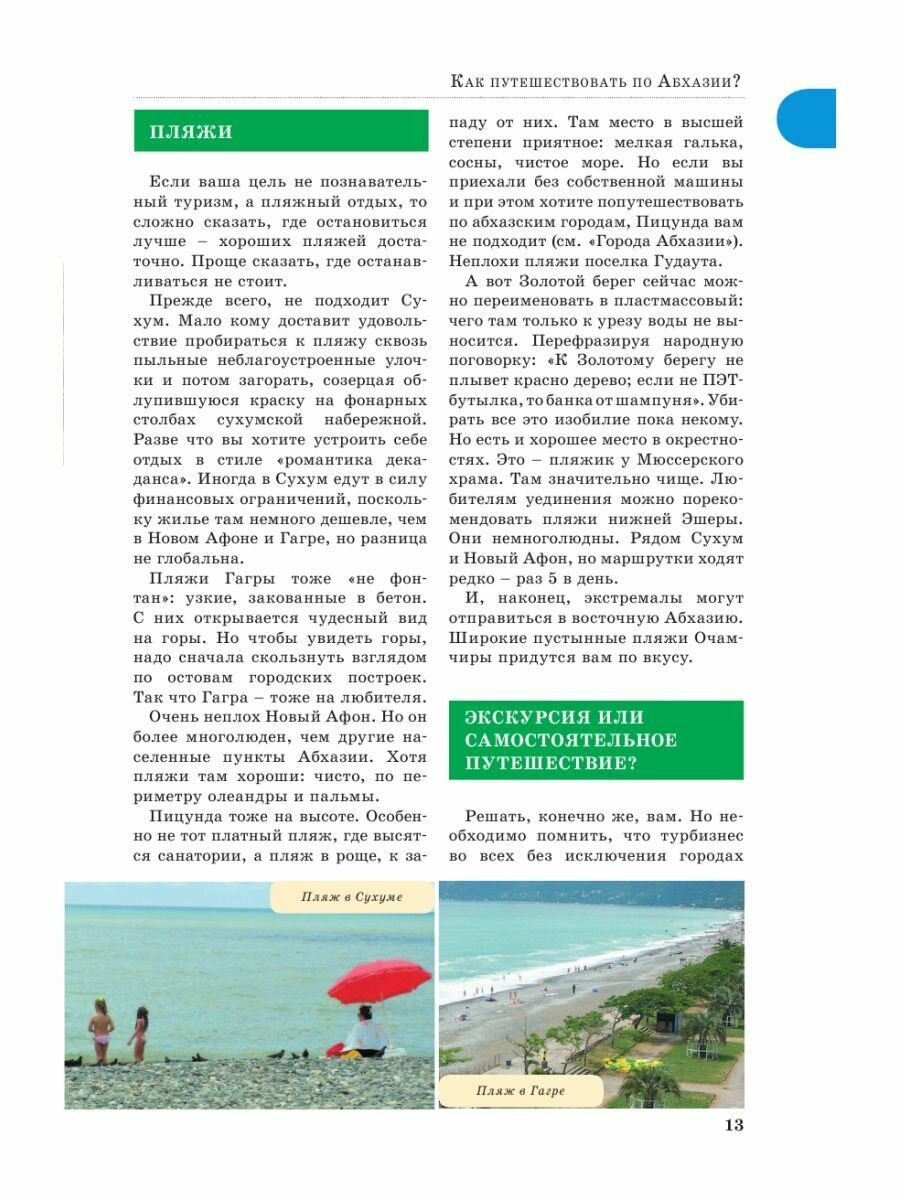 Самый лучший путеводитель из всех что я видела по Абхазии. Не просто карта и список достопримечательностей, а именно прогулки - читаешь путеводитель и шагаешь себе, как раз для таких как я, кто не любит организованные экскурсии. Долой стереотипы - будто в Абхазии обязательно посетить обезьянник в Сухуме и озеро Рица. Да там много всего любопытного на каждом шагу, или чуть в сторону от популярных троп массового туриста. Интересные места и непопсовые маршруты.