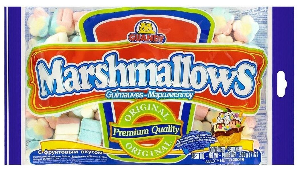 Технология производства маршмеллоу GUANDY разработана специально для России, учитывает наши климатические особенности и соблюдает все требования к такому нежному продукту! Поэтому именно наш маршмеллоу идеально жарится на огне и плавится при тепловой обработке, максимально долго сохраняет свою мягкость и упругость даже после вскрытия упаковки, а также создает самую стойкую и нежную ванильную пенку при использовании в напитках. Среди европейских сладостей маршмеллоу GUANDY уже много лет занимает лидирующие позиции компания GUANDY ведущий производитель маршмеллоу в мире.