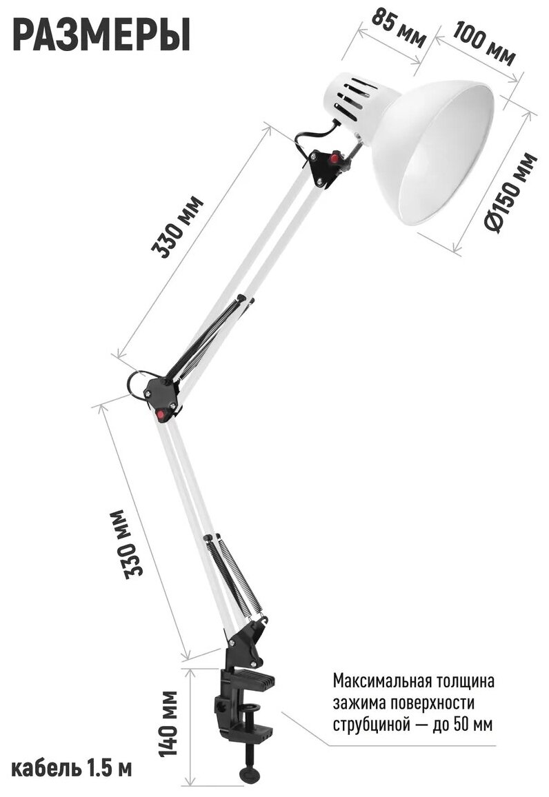 У данной модели качественный металлический корпус, рассчитанный на длительное использование. Длина провода равна 1,5 м. Прибор работает от обычной электрической сети. Посредством переключателя на кабеле осуществляется включение и выключение светильника. Установочный набор предусмотрен в комплекте.