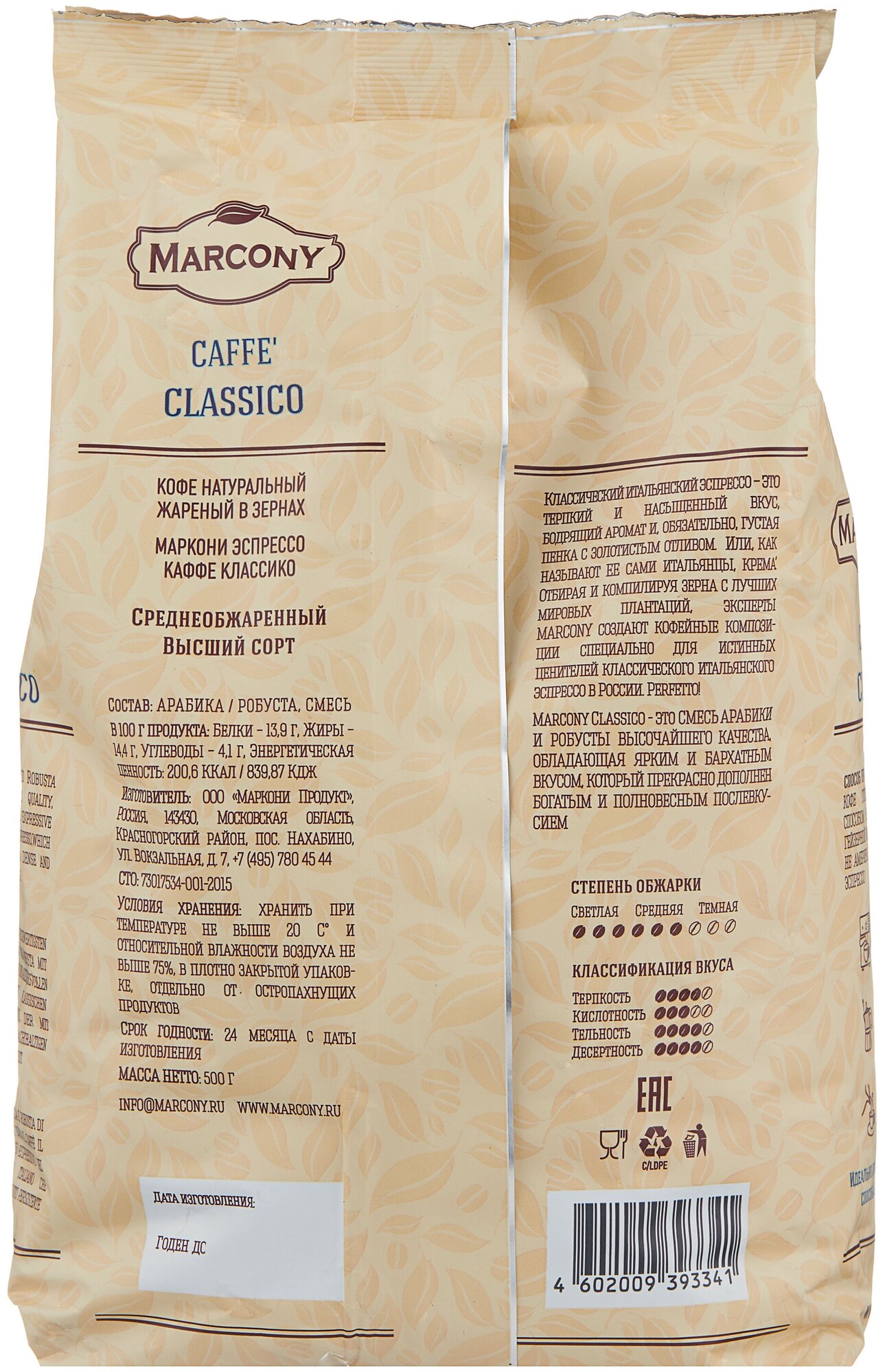Кофе в зернах Marcony Classico Кофе зерно 500г