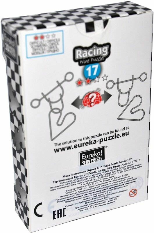 Европейское качество по доступной ценеГоловоломки Eureka проектируют в Бельгии, а производят в разных странах под контролем головного предприятия. Так компания следит за качеством, но обеспечивает доступную стоимость. Эти проволочные головоломки стильно выглядят и удобно лежат в руке. Их легко брать их в дорогу и проносить в кармане на скучные мероприятия, потому что они небольшие и лёгкие. Эврика помогает развить логику, наблюдательность, пространственное мышление и воображение, способность рассуждать нестандартно и отыскивать выход из сложных обстоятельств. Ещё они отлично тренируют мелкую моторику, что особенно полезно для детей и пожилых людей.