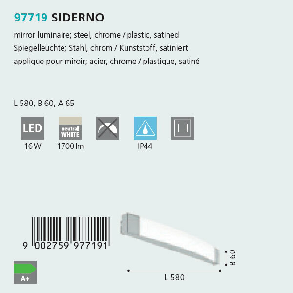 Настенный светильник светодиодный Siderno - продукт известной компании Eglo (Австрия). Имеет максимальную мощность 16 Вт. Отлично подойдет для таких мест, как ванная. Впишется в интерьеры следующих стилей: современный.