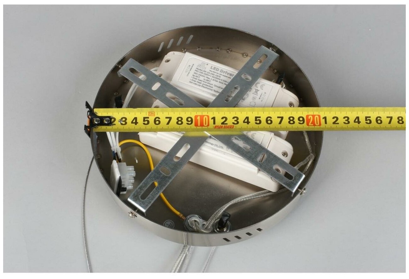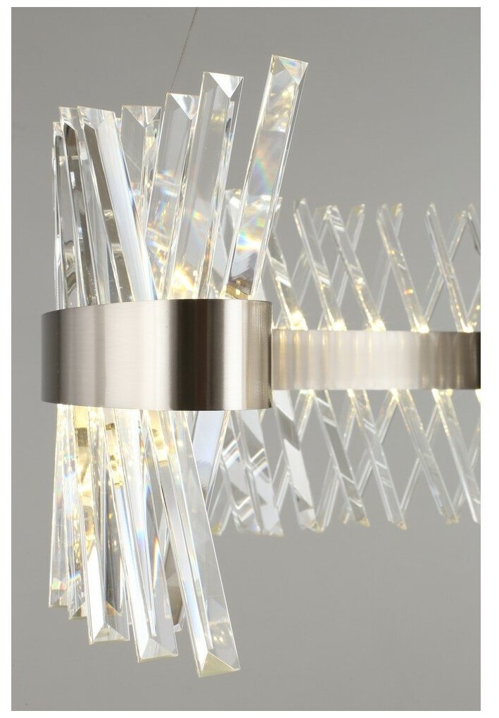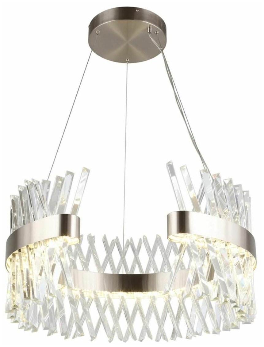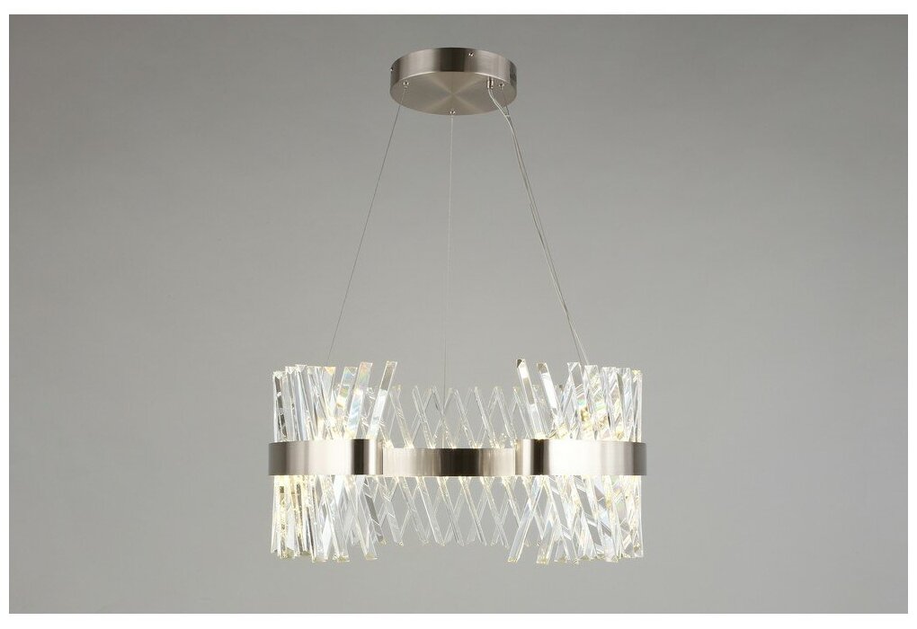 Люстра подвесная светодиодная, цвет покрытия - никель. В люстре установлена 1 светодиодная лампа мощностью 62 Вт. Рекомендуемая площадь освещения 12 кв.м. Способ крепления: на монтажную пластину, которая прикручивается к потолку. В комплекте: гарантийный талон, схема сборки, монтажная пластина и крепежные саморезы.