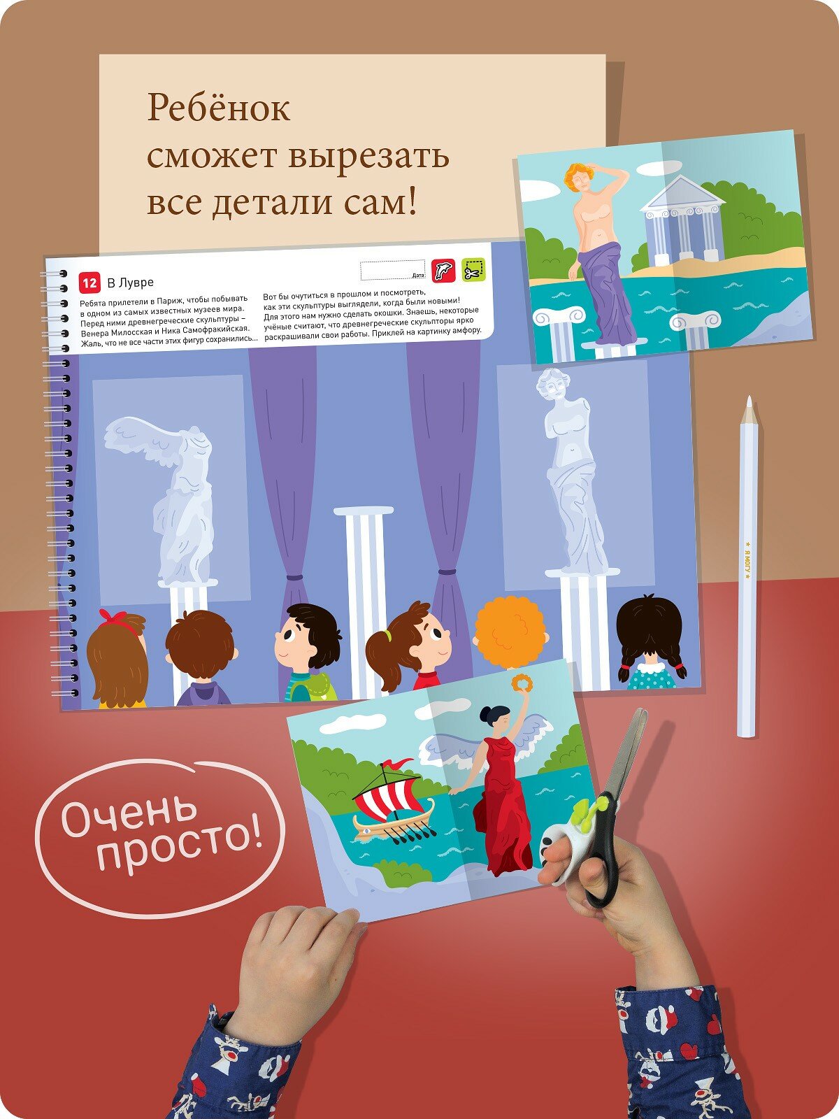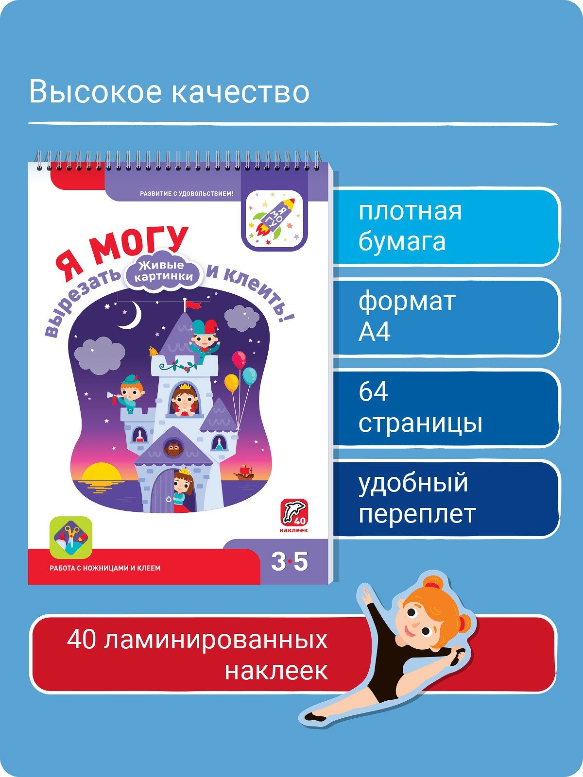 Журнал с заданиями формата А4, бумага плотная, немного наклеек для дополнения заданий. Но основная задача ребенка - выполнение однотипных вырезать прямоугольники и приклеить их на соответствующее место. Журнал достаточно интересный, ребенок делал с удовольствием. Но в плане разнообразия заданий конкурирующее пособие "Я умею вырезать и клеить" более удачное.