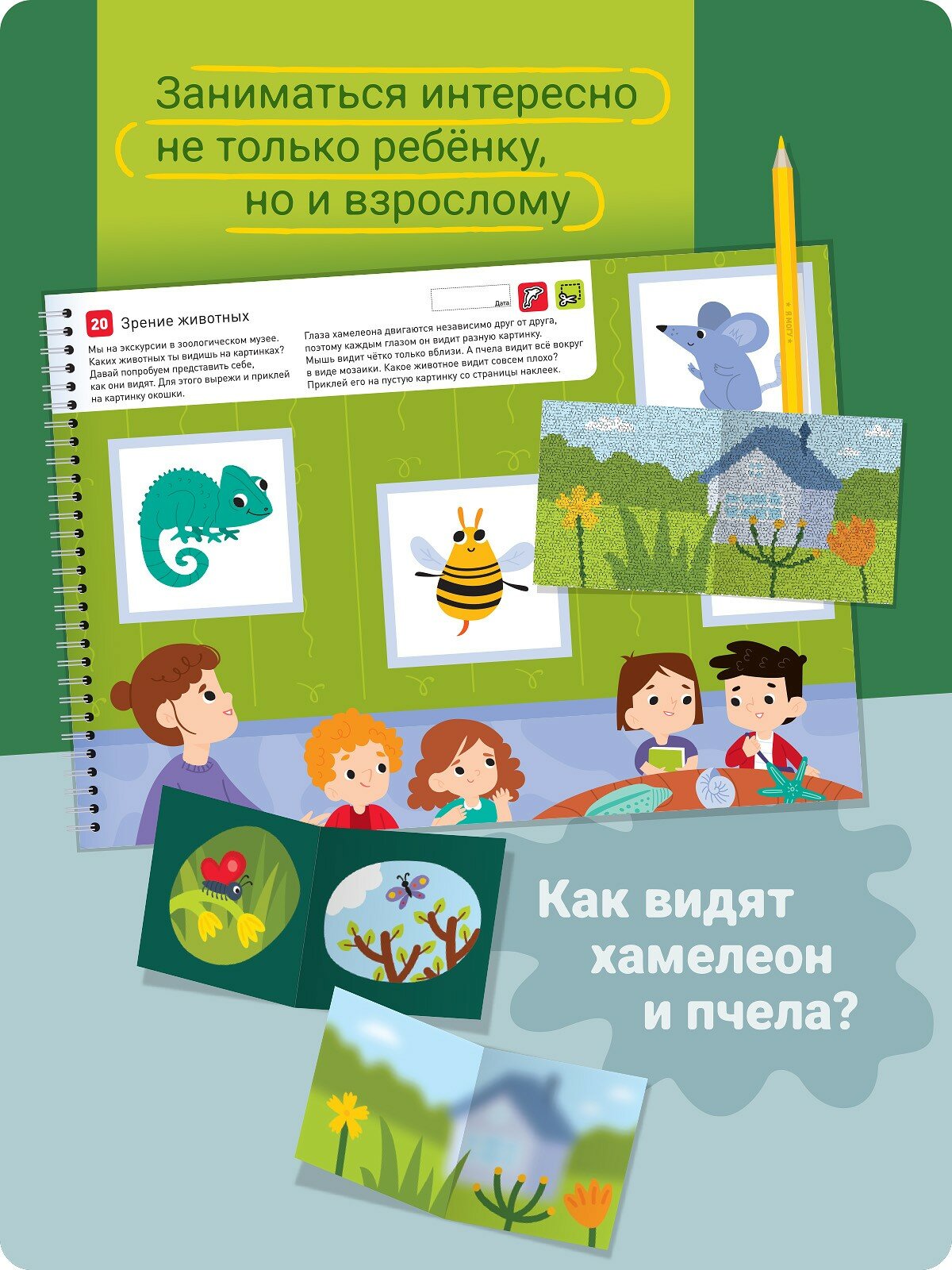 Это не просто тетрадь, а мини-энциклопедия, которую ребёнок сделает сам. Как работает шлюз? Из чего делают красный краситель кармин? Как видят хамелеон и пчела? Заниматься интересно не только ребёнку, но и взрослому!