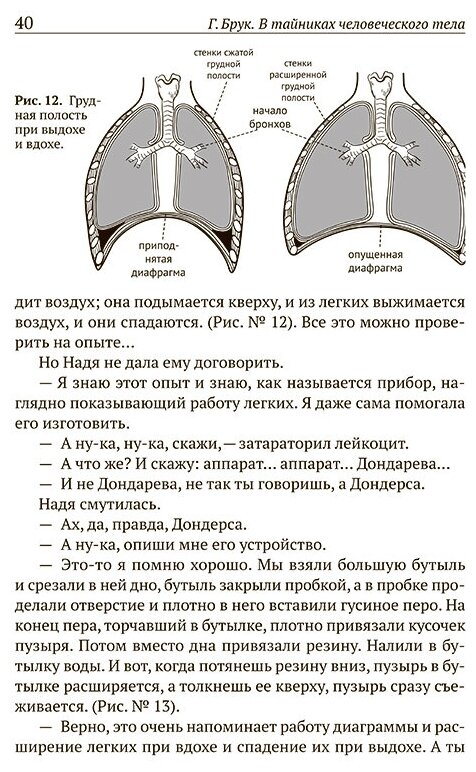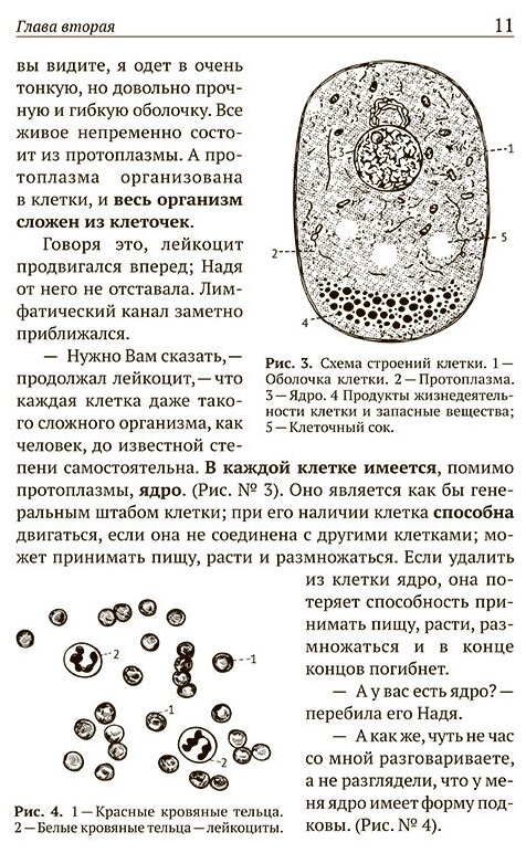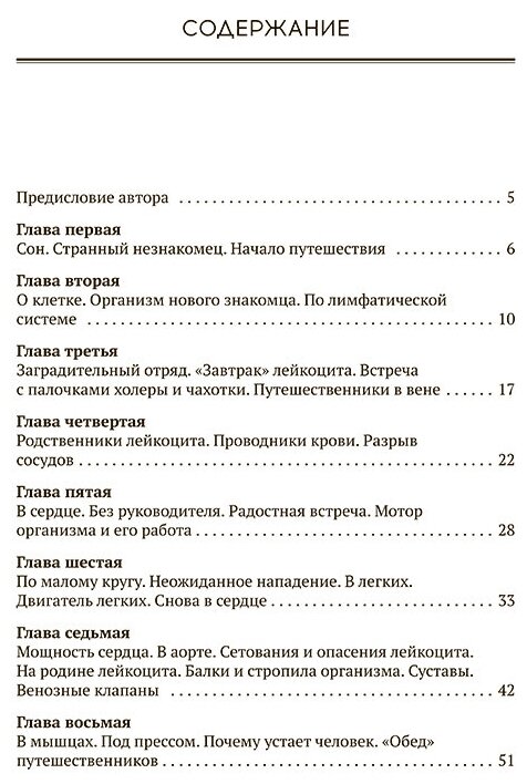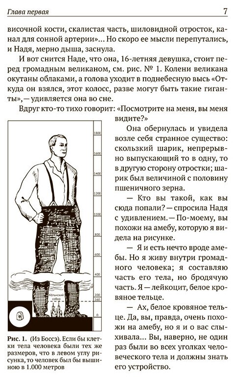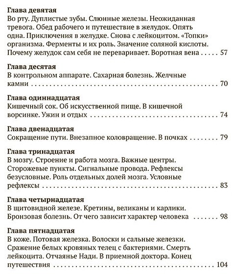 Почему синяк сначала синий, а потом — желто-зеленый? Сколько килограммов может выдержать бедренная кость? Как температура нашего тела связана с дыханием? Что такое лейкоциты и сколько их содержится в кубическом миллиметре крови? Это и многие другие любопытные факты о работе сердца, легких, мозга и других органов девочка Надя узнаёт во время увлекательного путешествия по человеческому телу. А проводником и гидом ей служит дружелюбный лейкоцит. Он знакомит ее с анатомией и физиологией человека и объясняет, почему мы растем и меняемся и как болеем и выздоравливаем. И полученные знания не выветрятся из ее головы, ведь она увидела все собственными глазами, а не услышала на скучном уроке… Написанная доступным языком, эта книга понравится детям, а ее содержание надолго останется в их памяти.