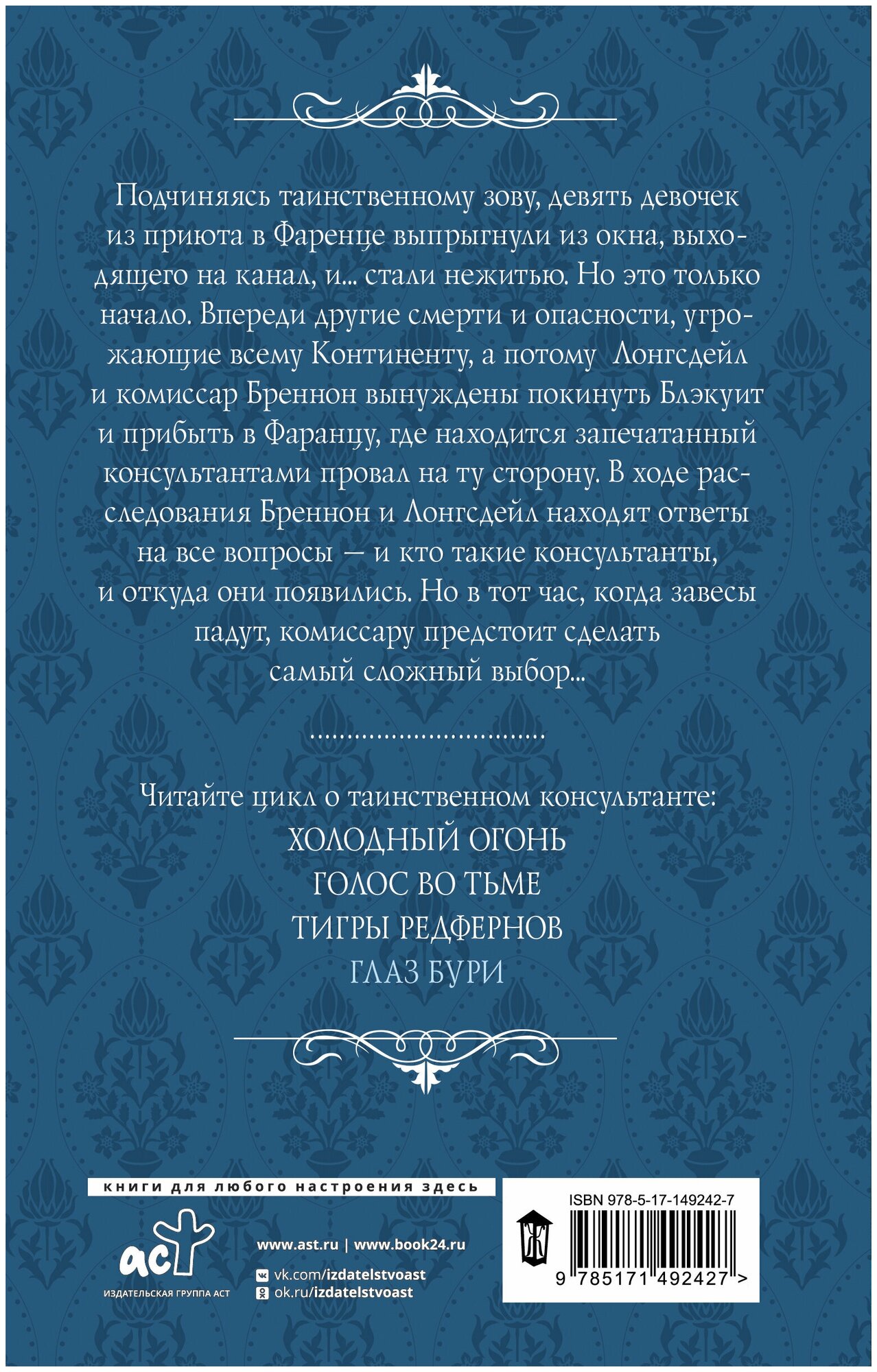 Подчиняясь таинственному зову, девять девочек из приюта в Фаренце выпрыгнули из окна, выходящего на канал, и... стали нежитью. Но это только начало. Впереди другие смерти и опасности, угрожающие всему Континенту, а потому Лонгсдейл и комиссар Бреннон вынуждены покинуть Блэкуит и прибыть в Фаранцу, где находится запечатанный консультантами провал на ту сторону. В ходе расследования Бреннон и Лонгсдейл находят ответы на все вопросы - и кто такие консультанты, и откуда они появились. Но в тот час, когда завесы падут, комиссару предстоит сделать самый сложный выбор...