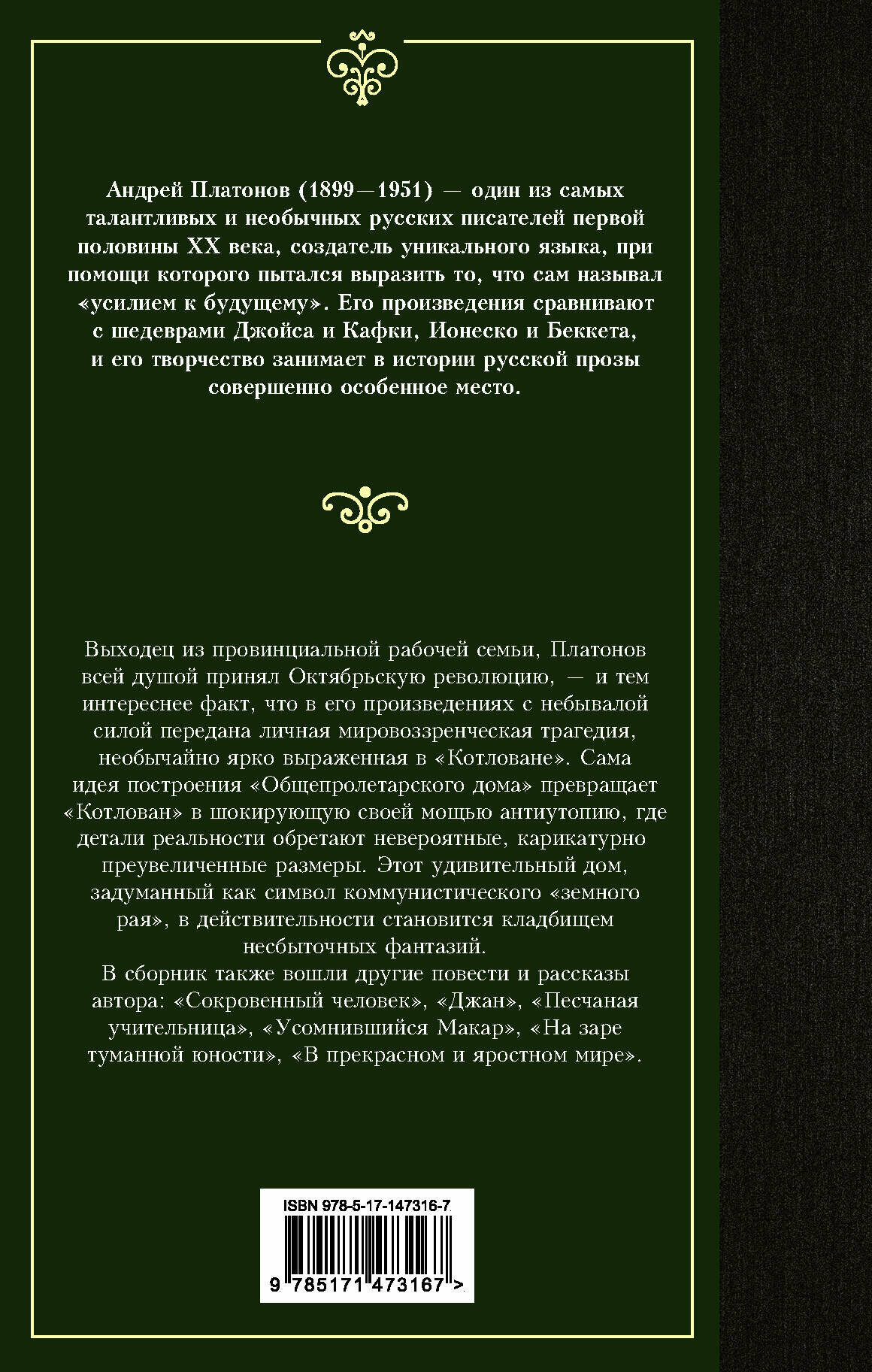 Данная книга отлично подошла для знакомства с автором Платоновым. Издание с твердой и стильной обложкой, содержит помимо произведения «Котлован» еще несколько повестей, что очень удобно, все что нужно для ознакомления с творчеством автора уместили в одну книгу. К слову, автор пишет великолепно, слог замечательный, читать приятно, качество книги отличное, текст пропечатан хорошо, шрифт четкий.