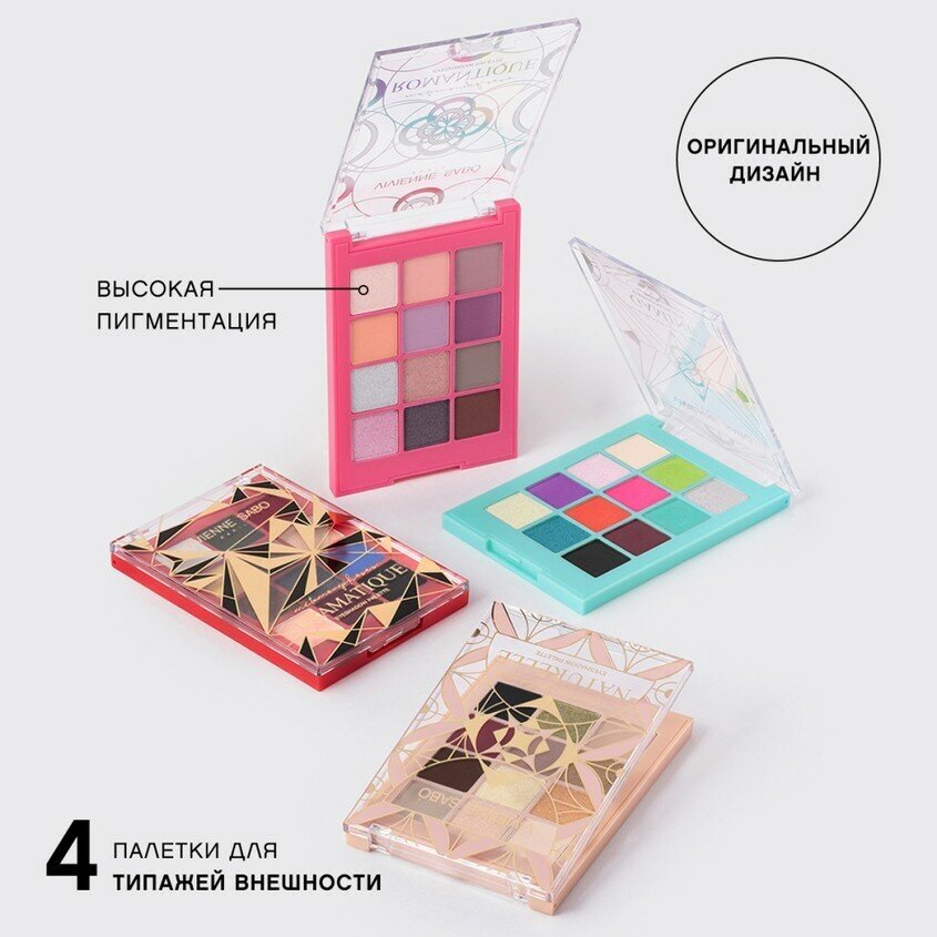 Палетка подойдёт для дневного и вечернего макияжа. В ней 12 универсальных оттенков с матовым, сатиновым и сияющим финишем.