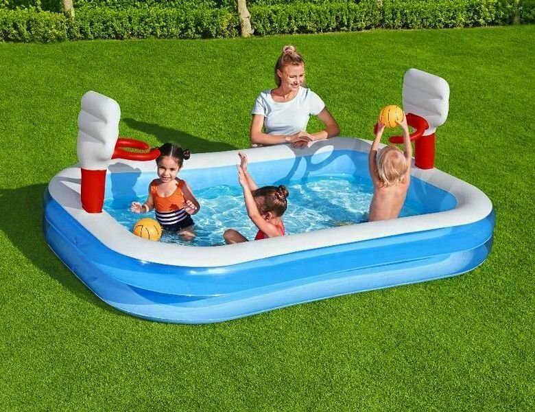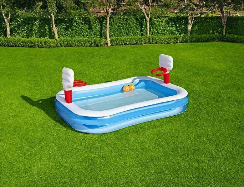 В этом надувном игровом бассейне Bestway у ваших детей будут обручи для классных и точных бросков. В нем можно купаться и играть в игру! Кроме того, широкие стенки обеспечивают устойчивость и поддержку для детей. Он прост в установке, а убрать его легко с помощью дренажного клапана.