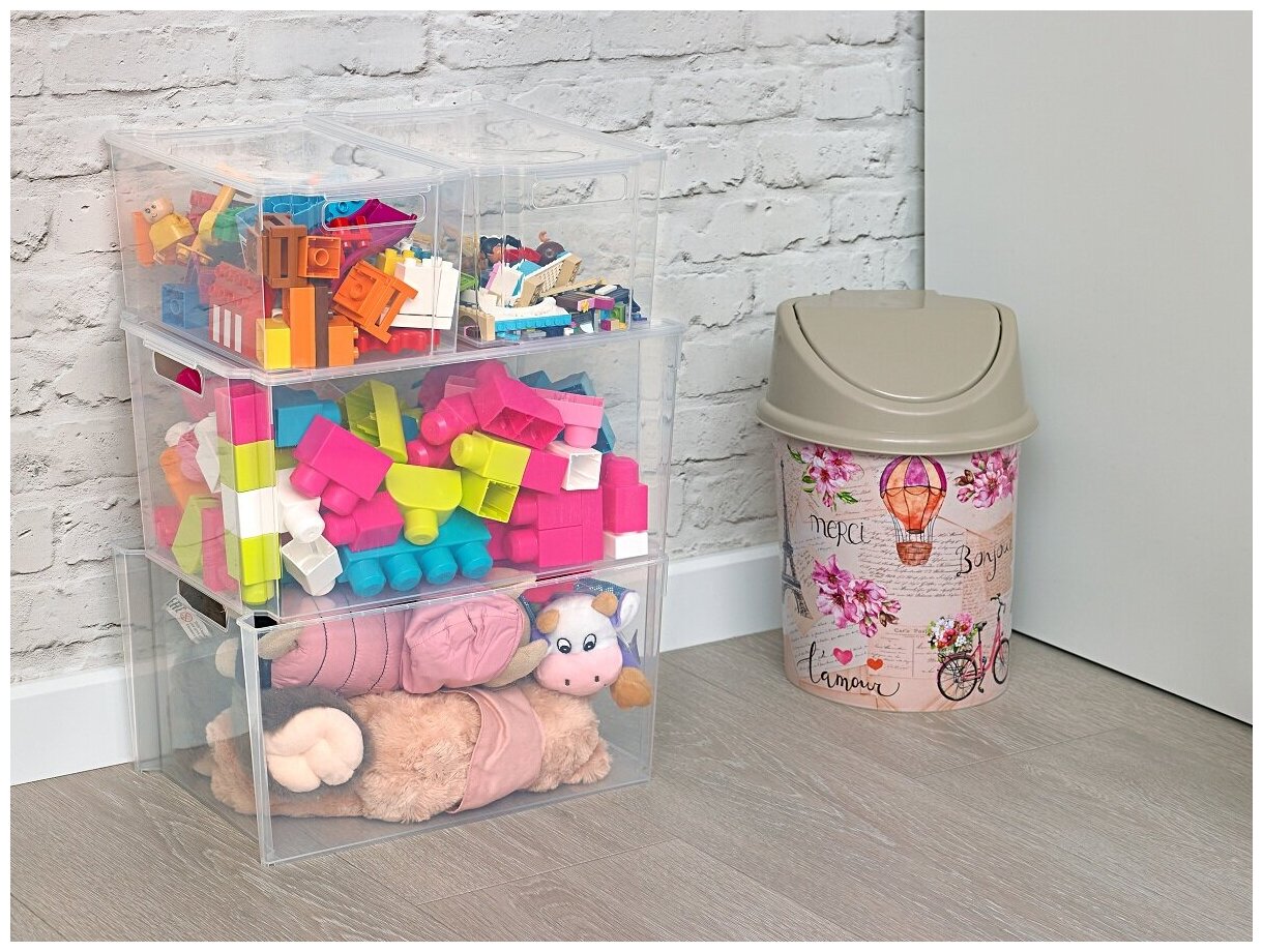 Благодаря специальной конструкции крышек и пазам на нижней поверхности, ящики можно штабелировать друг на друга, как с крышками так и без. Изделие имеет ручки с двух сторон, что удобно для использования и переноски. Крышка надежно защёлкивается на ящике, предотвращая тем самым выпадение содержимого. Каждое изделие укомплектовано декоративной наклейкой, демонстрирующей свойства продукта и варианты использования.