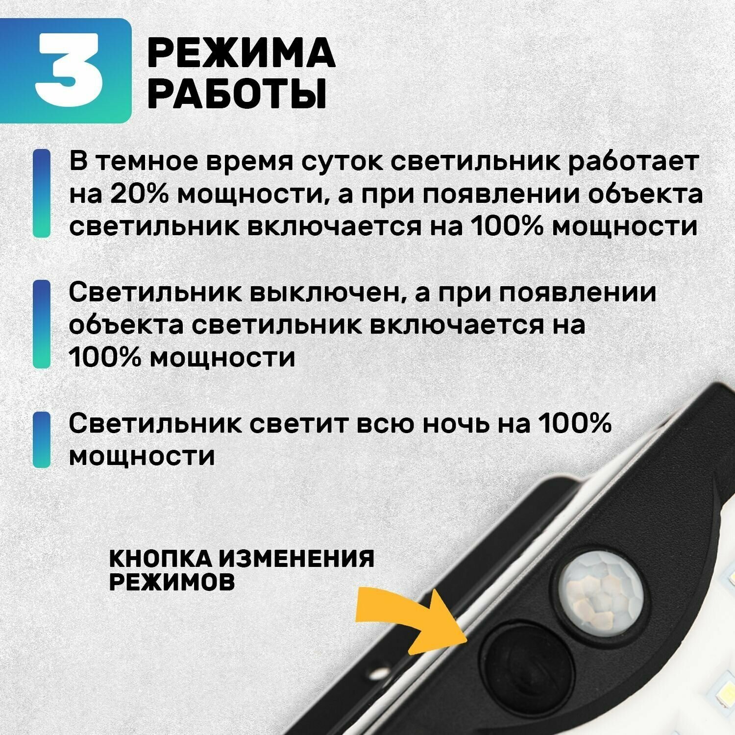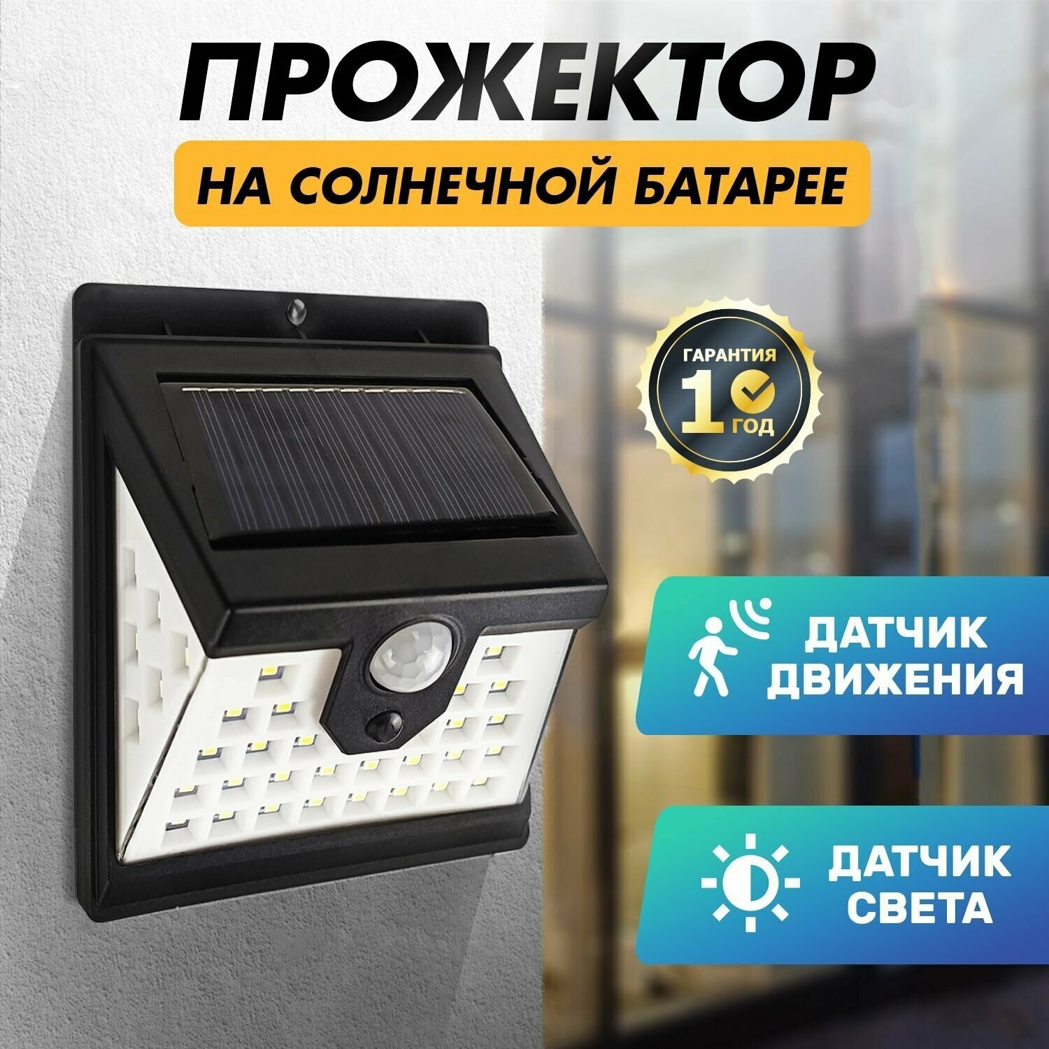Оснащен датчиком света и датчиком движения.