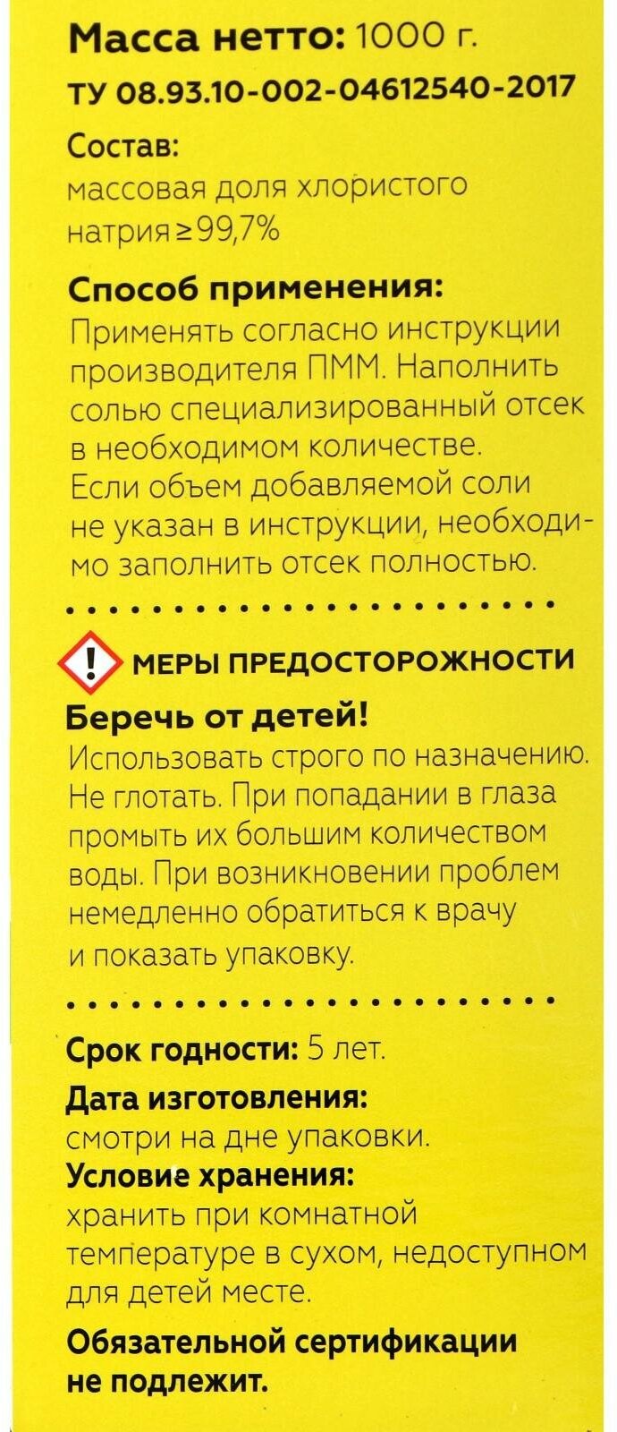 | Состав | массовая доля хлористого натрия не менее 99,7%. |