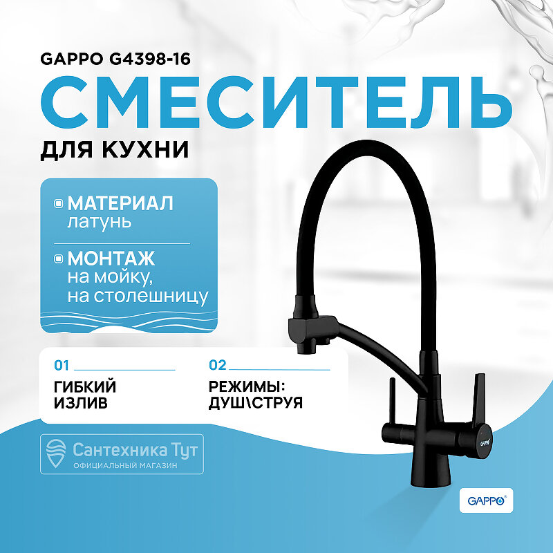Смеситель для кухни со встроенным фильтром (краном) под питьевую воду Gappo G4398-16. Однорычажный. Цвет - Черные. Способ монтажа - На одно отверстие, На гайке. Материал - Силиконовые, Латунь. В комплекте - Гибкая подводка 1/2
