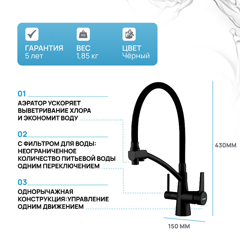 | Дополнительная информация | Со встроенным фильтром, излив длинный, гибкий, поворотный. |