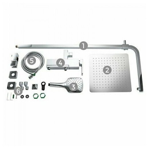 | ВКоробке | Душевая стойка - 1 шт. Верхний душ - 1 шт. Лейка - 1 шт. Шланг - 1 шт. Смеситель - 1 шт. Эксцентрик - 2 шт. Инструкция - 1 шт. |