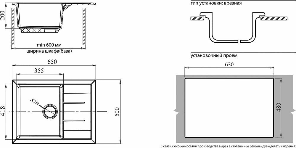 Общий размер: 650х500 мм. Размер чаши: 355х418х200 мм. Тип монтажа: классический врезной. Установочный проем: 630*480 мм. Материал: мраморный композит. Производство: Россия. Гарантия: 2 года