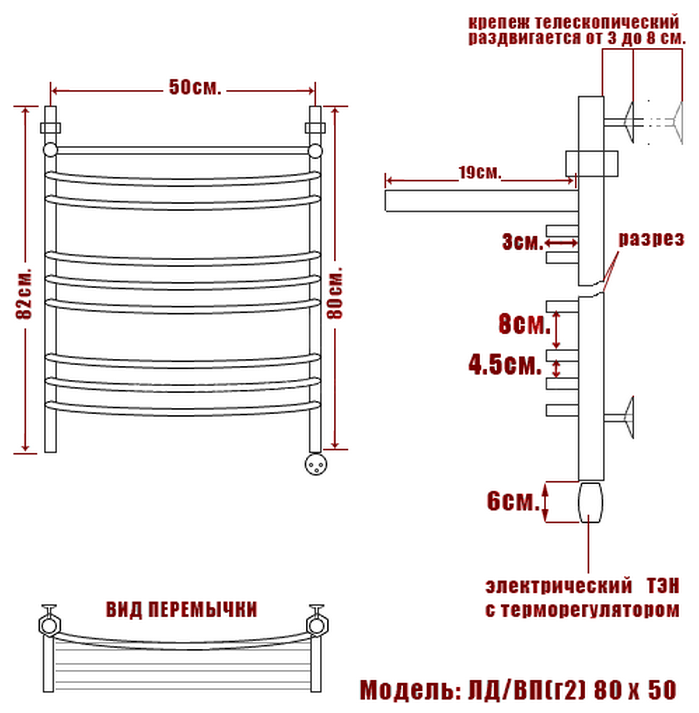 Электрический полотенцесушитель Ника ARC ЛД (Г2) ВП 80/50 правый тэн (ЛД Г2 ВП 80/50 прав)