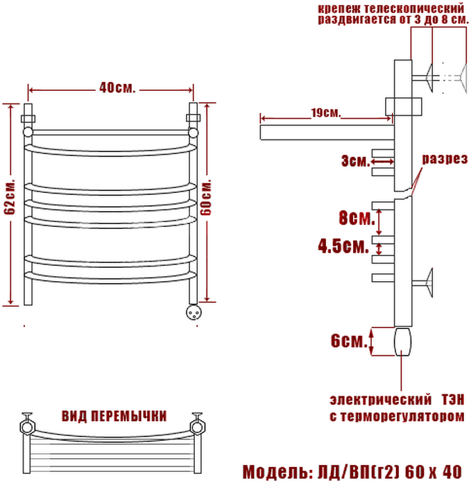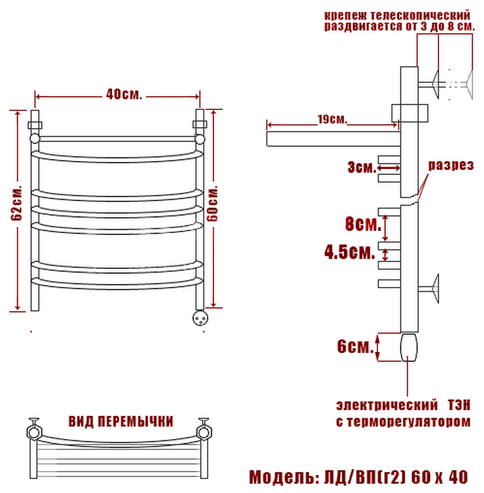 Электрический полотенцесушитель Ника ARC ЛД (Г2) ВП 60/40 правый тэн (ЛД Г2 ВП 60/40 прав)