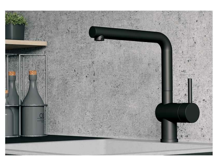 Особенно хорошо новый цвет сочетается с мойками в серых тонах или новом цвете бетон. Матовый черный цвет доступен для ограниченного ассортимента смесителей и аксессуаров.