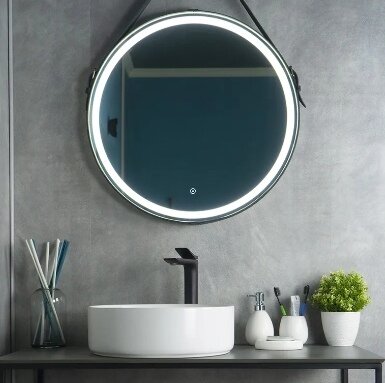 Нестандартное решение в санузле, круглая раковина на слэбе в три стенки с чёрным сифоном.