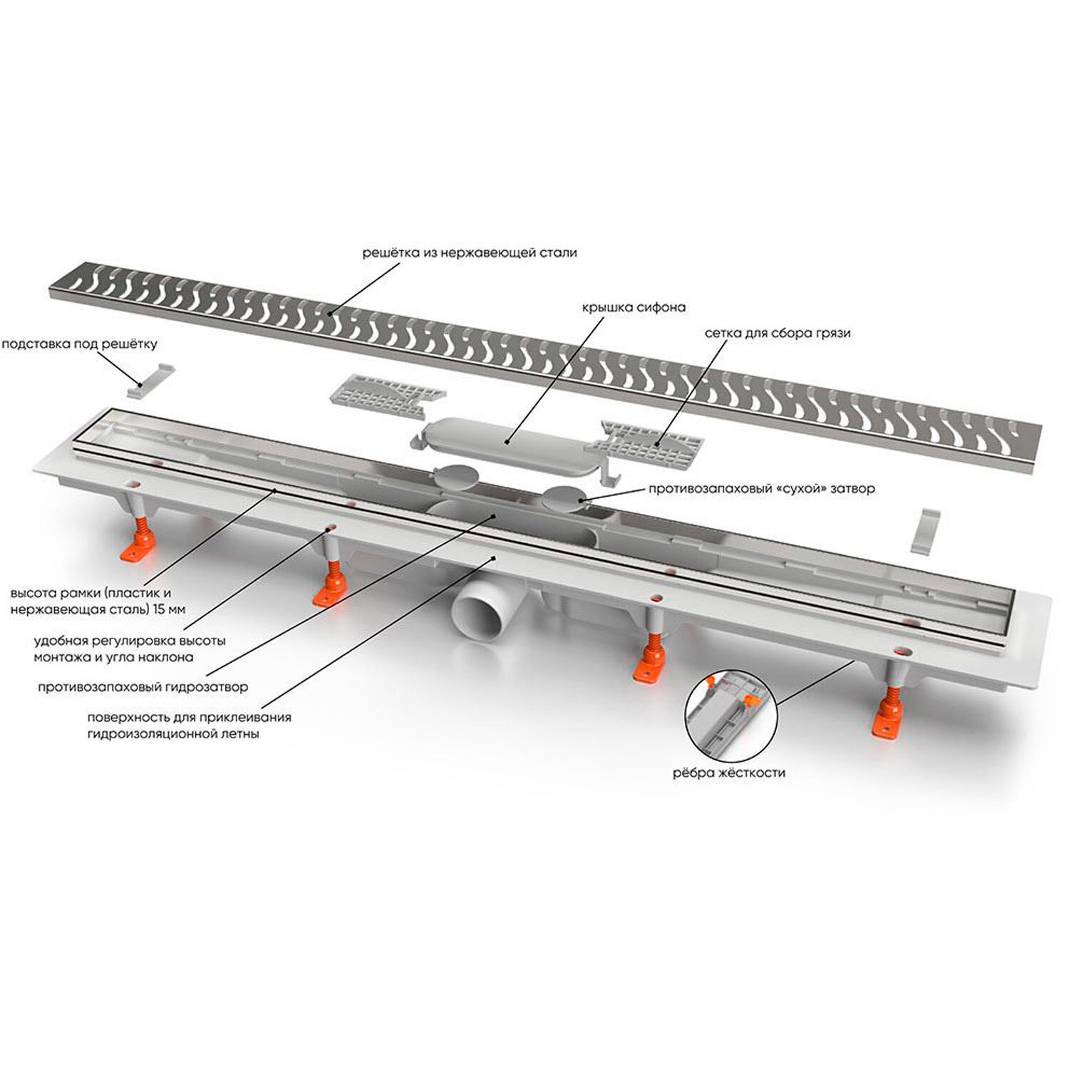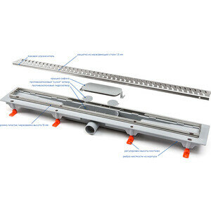 | Комплектация | душевой желоб; решетка; сифон; опоры; прокладка гидроизолирующая; инструкция |