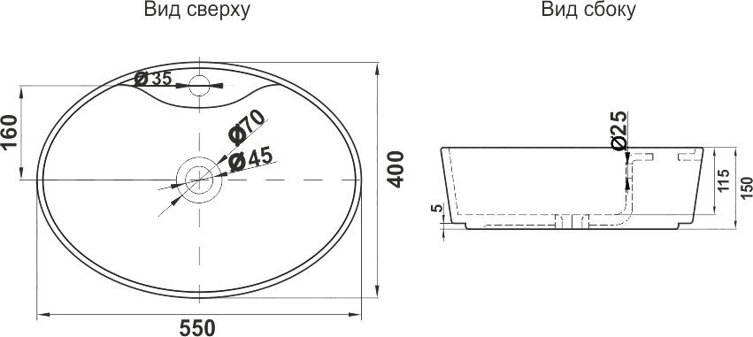 Ширина: 550. Глубина: 400. Высота: 150. Отверстие под перелив есть. Отверстие под смеситель есть. Отверстие под смеситель