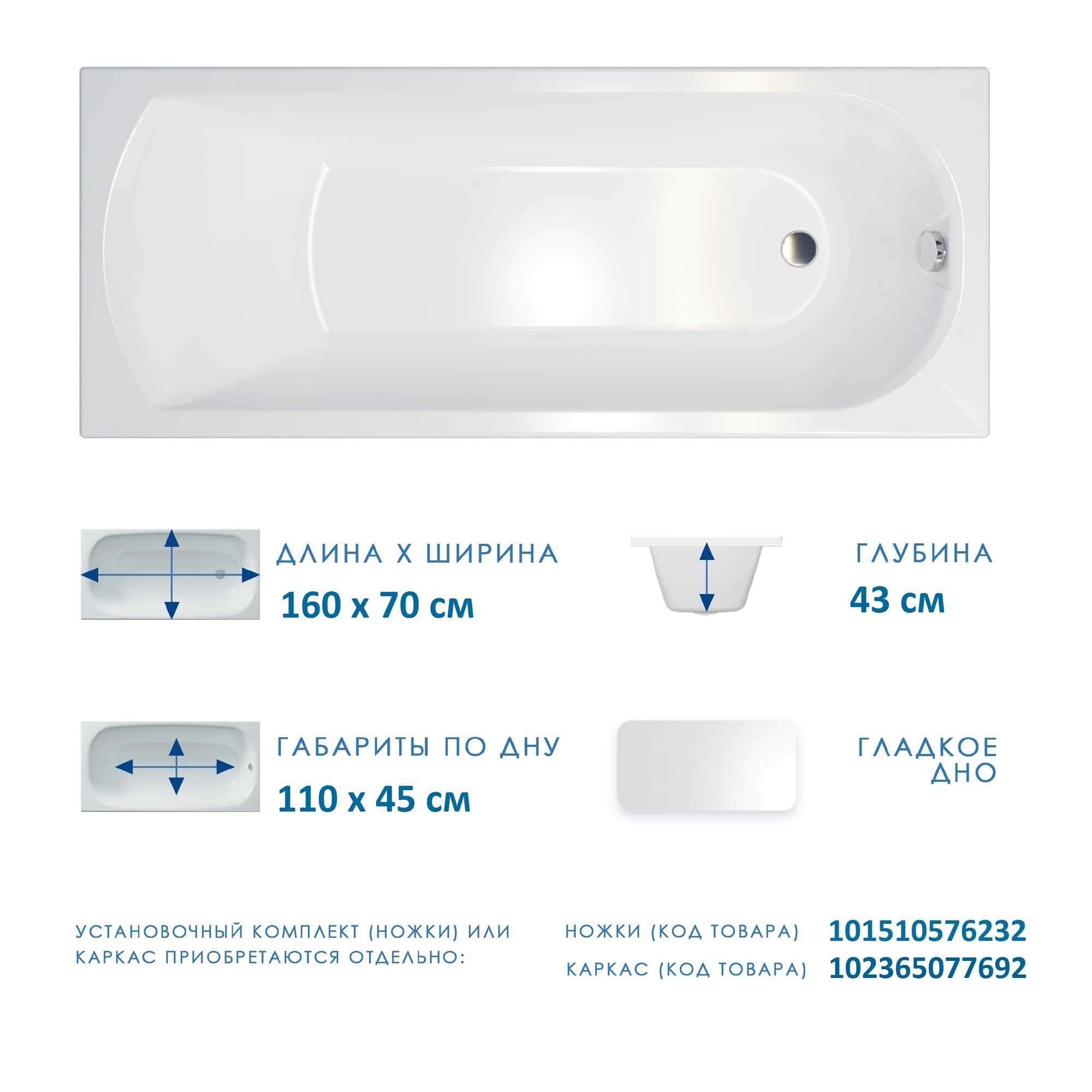 Комплектация: чаша ванны. Каркас, слив-перелив и экран заказываются отдельно (смотрите дополнительную комплектацию). Классические формы и плавные линии украсят любую ванную комнату. Широкий размерный ряд позволяет разместить ванну в санузлах разной площади.Удобный наклоном спинки помогает с комфортом разместится в ванне.Ванна из акрила приятная и теплая на ощупь. Гладкая поверхность и антибактериальные свойства поверхности препятствуют размножению бактерий и облегчает уход за ванной. Ванну можно установить на ножки или каркас повышеной прочности на выбор. Дополнительно можно укомплектовать ручками, подголовником и смесителем.